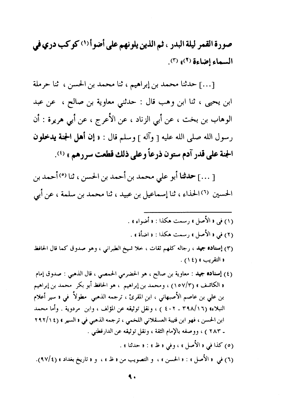 ( ... ) - حَدَّثنا مُحَمَّدُ بْنُ إِبْرَاهِيمَ، ثنا مُحَمَّدُ بْنُ الْحَسَنِ، ثنا حَرْمَلَةُ بْنُ يَحْيَى، ثنا ابْنُ وَهْبٍ قَالَ: حَدَّثَنِي مُعَاوِيَةُ بْنُ صَالِحٍ، عَنْ عَبْدِ الْوَهَّابِ بْنِ بُخْتٍ، عَنْ أَبِي الزِّنَادِ، عَنِ الْأَعْرَجِ، عَنْ أَبِي هُرَيْرَةَ: أَنَّ رَسُولَ اللَّهِ صَلَّى اللَّهُ عَلَيْهِ وَآلِهِ وَسَلَّمَ قَالَ: إِنَّ §أَهْلَ الْجَنَّةِ يَدْخُلُونَ الْجَنَّةَ عَلَى قَدْرِ آدَمَ سِتُّونَ ذِرَاعًا وَعَلَى ذَلِكَ قُطِعَتْ سُرُدُهُمْ