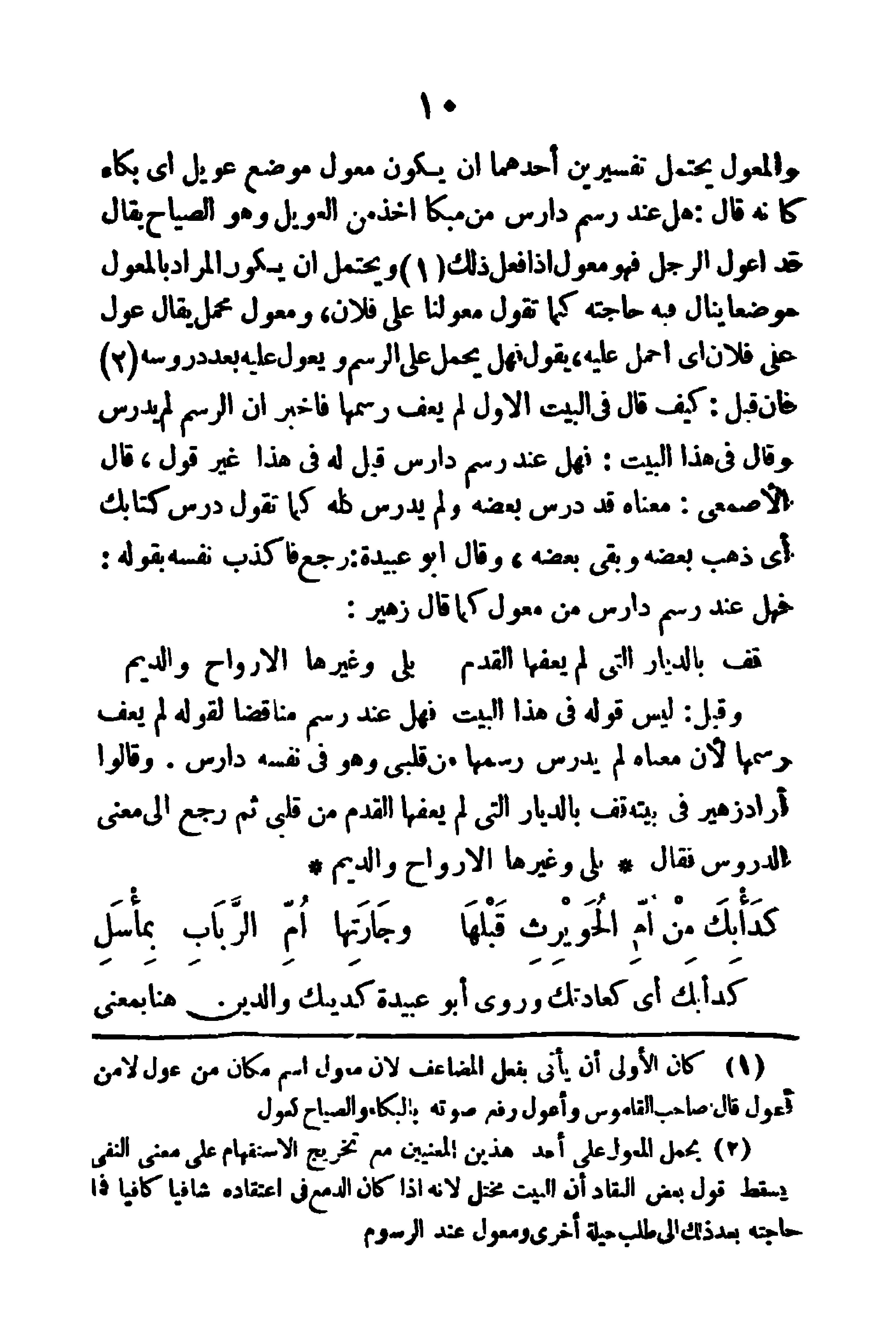 والمعول: يحتمل تفسيرين؛ أحدهما أن يكون معول موضع عويل، أي بكاء، كأنه قال: هل عند رسم دارس من مبكى؟ أخذ من العويل وهو الصياح، يقال: قد أعول الرجل فهو معول، إذا فعل ذلك، ويحتمل أن يكون المراد بالمعول موضعا ينال فيه حاجته، كما تقول: معوَّلنا على فلان، ومعول: محمل، يقال: عول على فلان، أي احمل عليه، يقول: فهل يحمل على الرسم ويعول عليه بعد دروسه؟