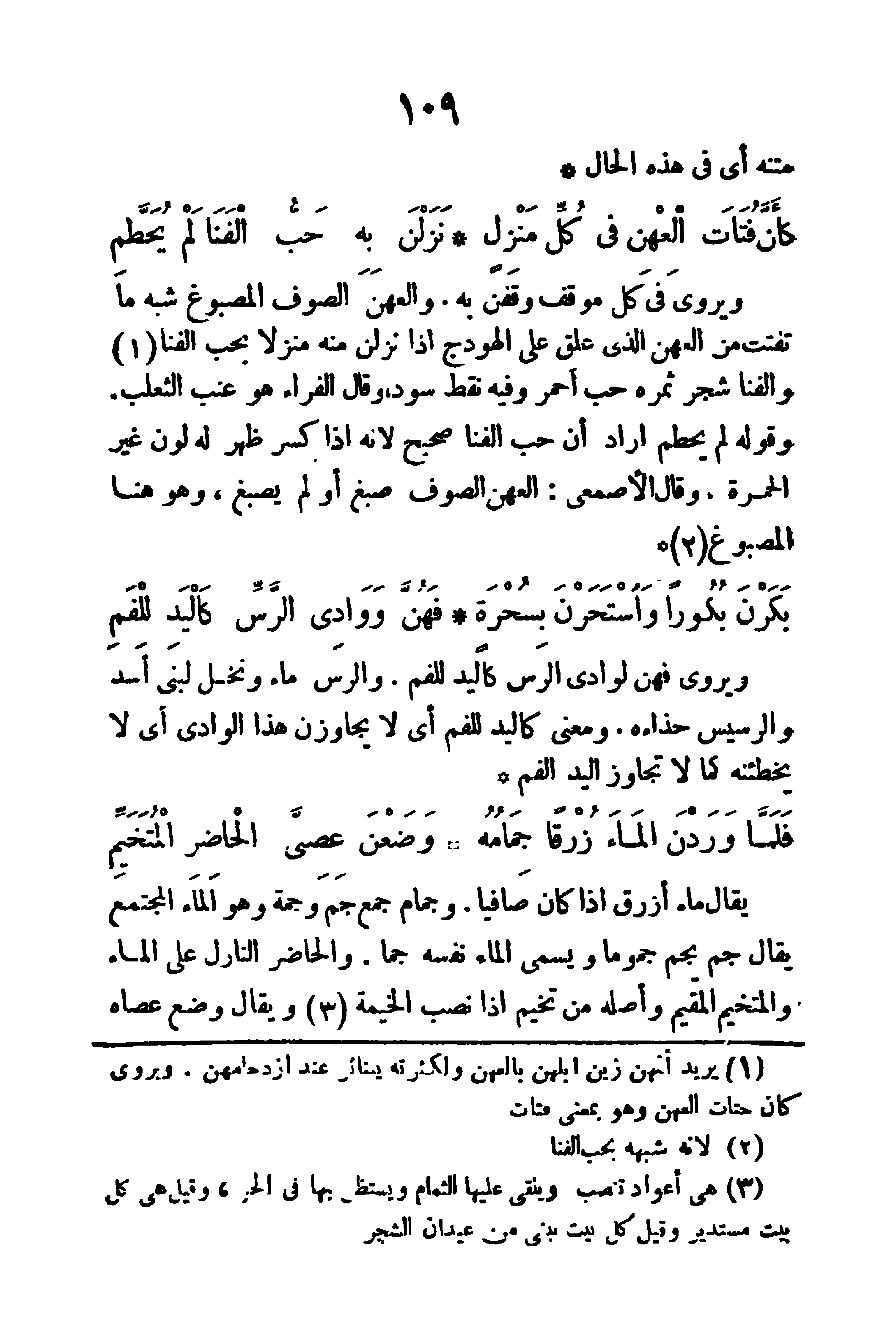 ويروى (في كل موقف وقفن به) والعهن: الصوف المصبوغ، شبَّه ما تفتت من العهن الذي علق على الهودج إذا نزلن منه منزلا بحب الفنا، والفنا: شجر ثمره حب أحمر وفيه نقط سود، وقال الفراء: هو عنب الثعلب، وقوله: (لم يحطم) أراد أن حب الفنا صحيح؛ لأنه إذا كسر ظهر له لون غير الحمرة، وقال الأصمعي: العهن الصوف صُبغ أو لم يصبغ، وهو هنا المصبوغ.