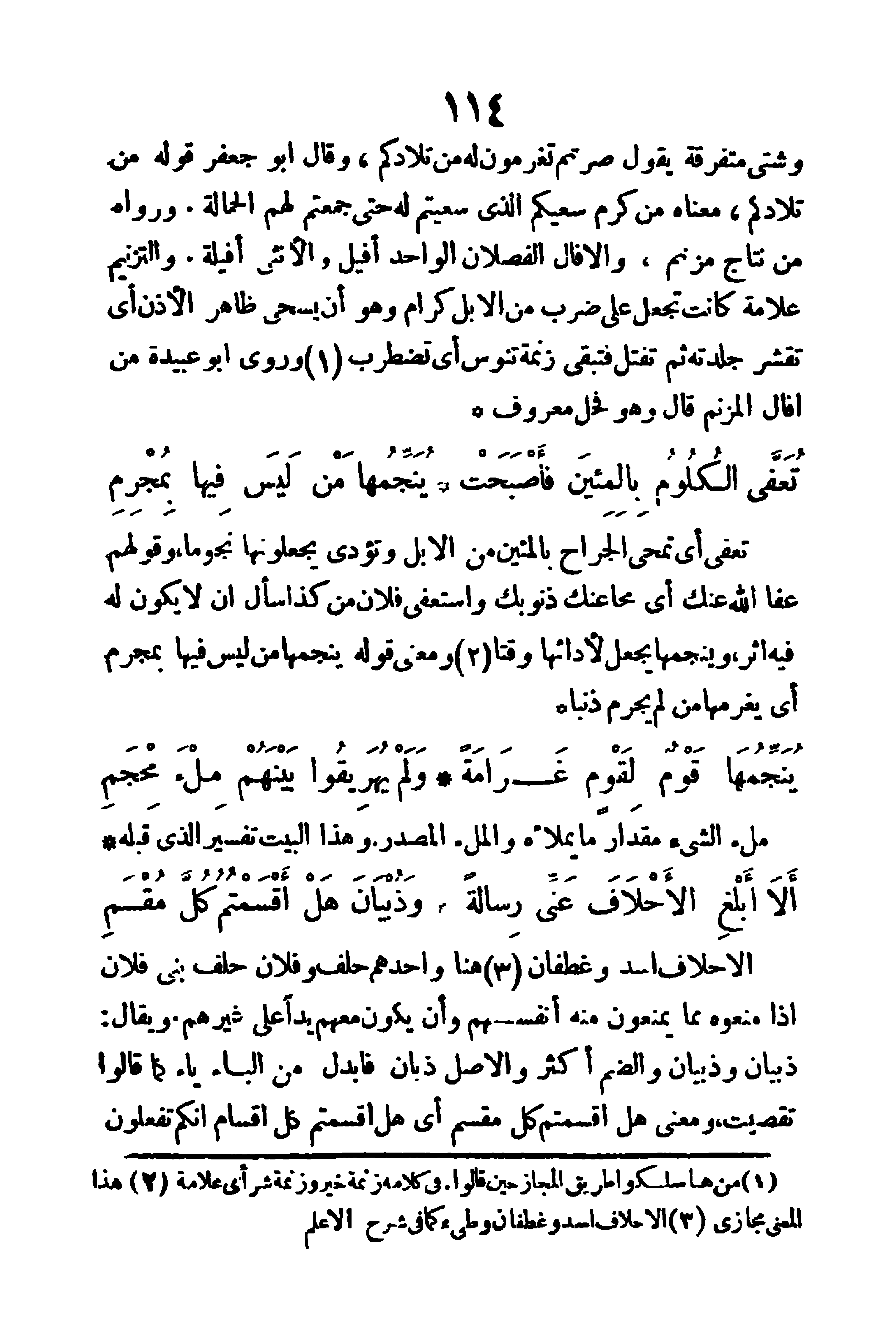وشتى: متفرقة، يقول: صرتم تغرمون له من تلادكم، وقال: أبو جعفر: قوله (من تلادكم) معناه من كرم سعيكم الذي سعيتم له حتى جمعتم لهم الحمالة. ورواه. ورواه (من نتاج مزنم) والإفال: الفصلان، الواحد أفيل، والأنثى أفيلة، والتزنيم: علامة كانت تجعل على ضرب من الإبل كرام، وهو أن يُسحى ظاهر الأذن، أي تُقشر جلدته ثم تفتل فتبقى زنمة تنوس، أي تضطرب، وروى أبو عبيدة (من افال المزنم) قال: وهو فحل معروف.