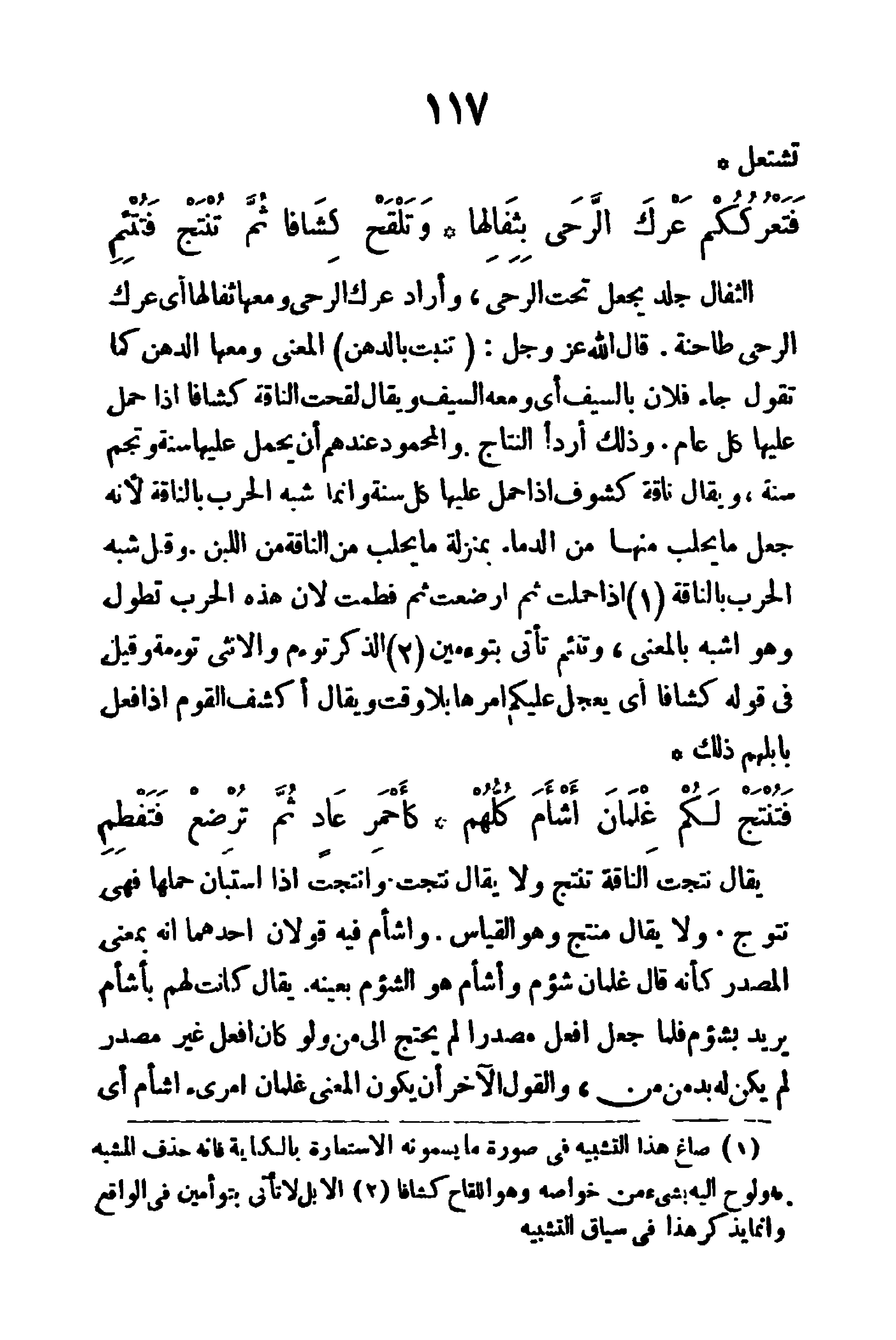الثفال: جلد يجعل تحت الرحى، وأراد عرك الرحى ومعها ثفالها، أي عرك الرحى طاحنة، قال الله عز وجل: (تَنْبُتُ بِالدُّهْنِ) المعنى ومعها الدهن، كما تقول: جاء فلان بالسيف، أي ومعه السيف، ويقال: لقحت الناقة كشافا؛ إذا حمل عليها كل عام، وذلك أردأ النتاج، والمحمود عندهم أن يحمل عليها سنة، وتجم سنة، ويقال (ناقة كشوف) إذا حمل عليها كل سنة، وإنما شبه الحرب بالناقة لأنه جعل ما يحلب منها من الدماء بمنزلة ما يحلب من الناقة من اللبن، وقيل: شبه الحرب بالنقاة إذا حملت ثم أرضعت ثم فطمت لأن هذه الحرب تطول، وهو أشبه بالمعنى، وتتئم: تأتي بتوأمين الذكر توأم والأنثى توأمة، وقيل في قوله (كشافا) أي يعجل عليكم أمرها بلا وقت ويقال (أكشف القوم) إذا فعل بإبلهم ذلك.
