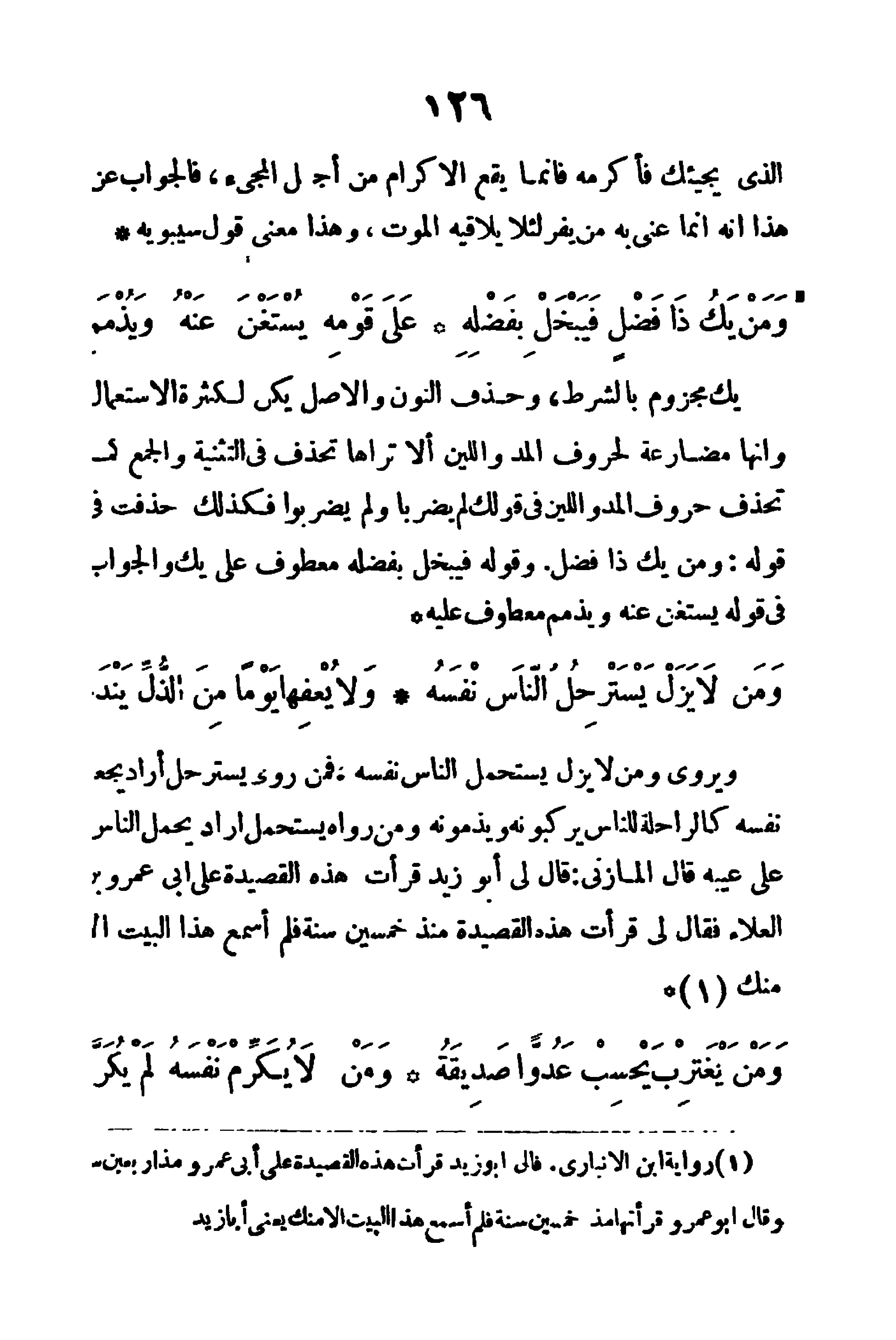 يك: مجزوم بالشرط، وحذف النون - والأصل يكن - لكثرة الاستعمال وأنها مضارعة لحروف المد واللين، ألا تراها تحذف في التثنية والجمع كما تحذف حروف المد واللين في قولك: لم يضربا، ولم يضربوا، فكذلك حذفت في قوله: (ومن يك ذا فضل) وقوله (فيبخل بفضله) معطوف على يك، والجوابي في قوله