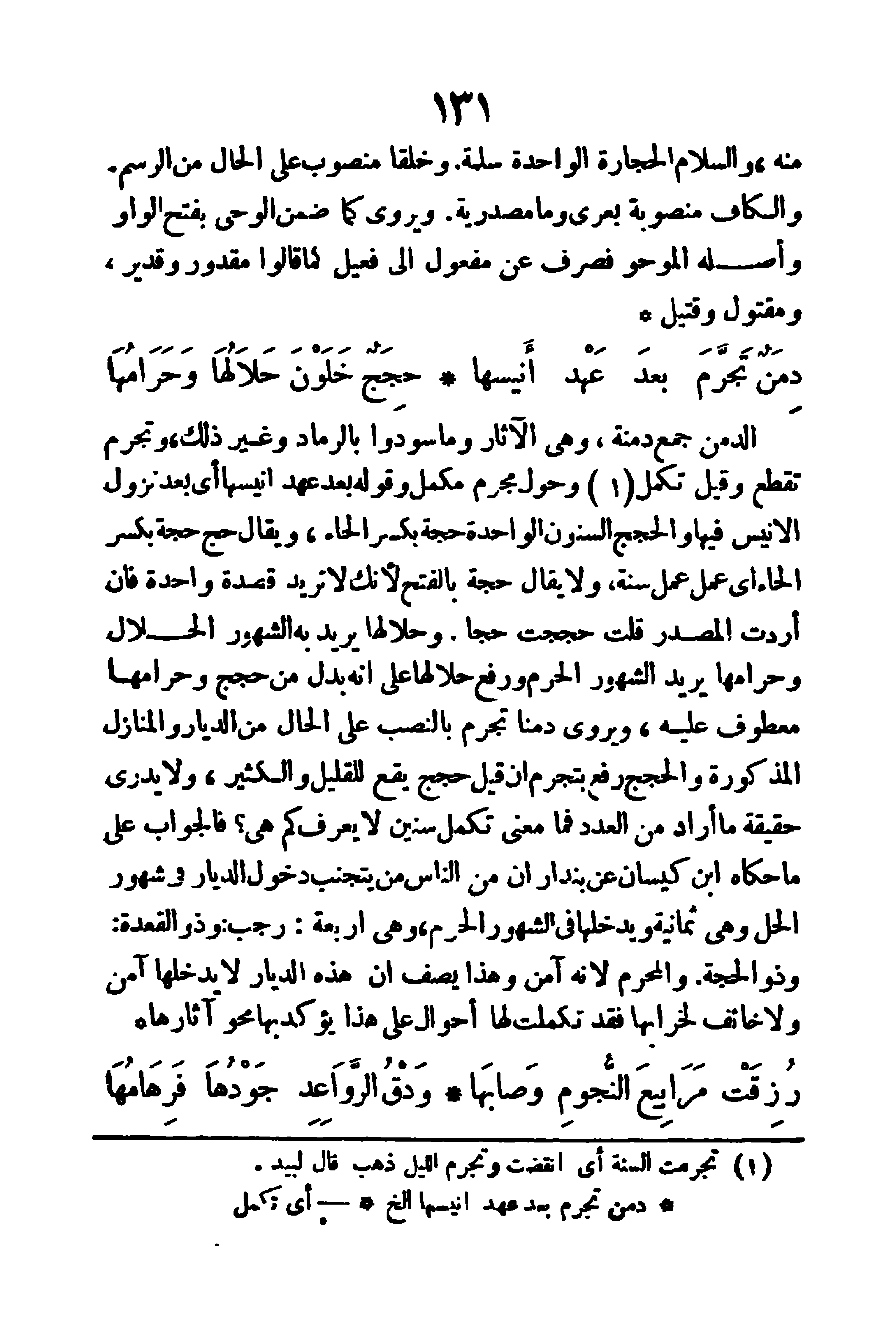 الدمن: جمع دمنة، وهي الآثار وما سودوا بالرماد وغير ذلك، وتجرَّم: تقطع، وقيل تكمل، وحول مجرم: مكمل، وقوله (بعد عهد أنيسها) أي بعد نزول الأنيس فيها، والحجج: السِّنُونَ، الواحدة حجة بكسر الحاء، ويقال (حَجَّ حِجَّة) بكسر الحاء، أي عمل عمل سنة، ولا يقال: حَجَّة بالفتح لانك لا تريد قصدة واحدة، فإن أردت المصدر قلت: حَجَجْتُ حَجَّا، و (حلالُها) يريد به الشهور الحلال، و (حرامها) يريد الشهور الحُرم، ورفع حلالها على إنه بدل من حِجَج، وحرامُها معطوف عليه، ويروى (دمنا تجرم) بالنصب على الحال من الديار والمنازل المذكورة، والحجج رفع بتجرَّم.