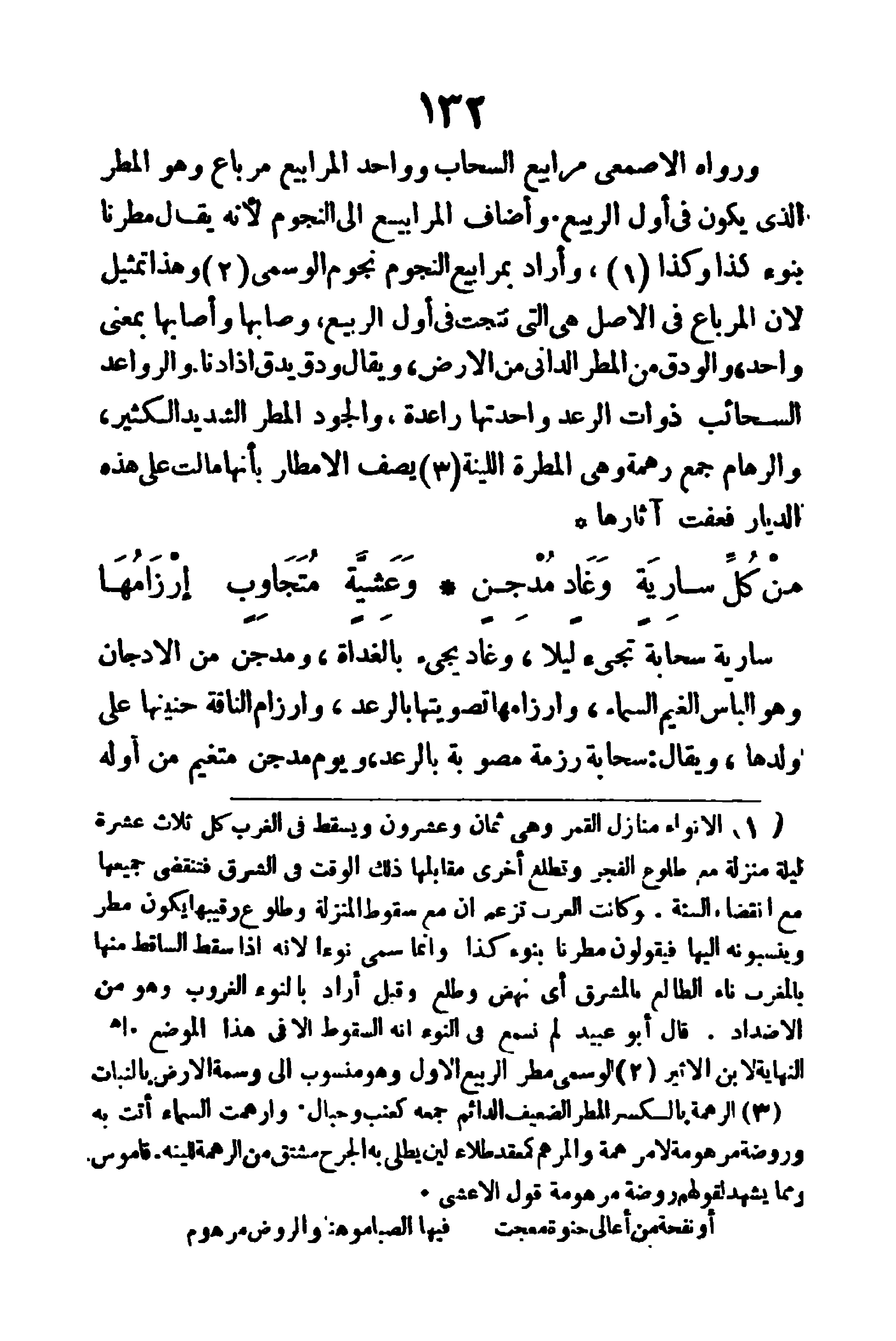 ورواه الأصمعي: (مرابيع السحاب) وواحد المرابيع مرباع، وهو المطر الذي يكون في أول الربيع، وأضاف المرابيع إلى النجوم لأنه يقال: مُطرنا بنوء كذا
