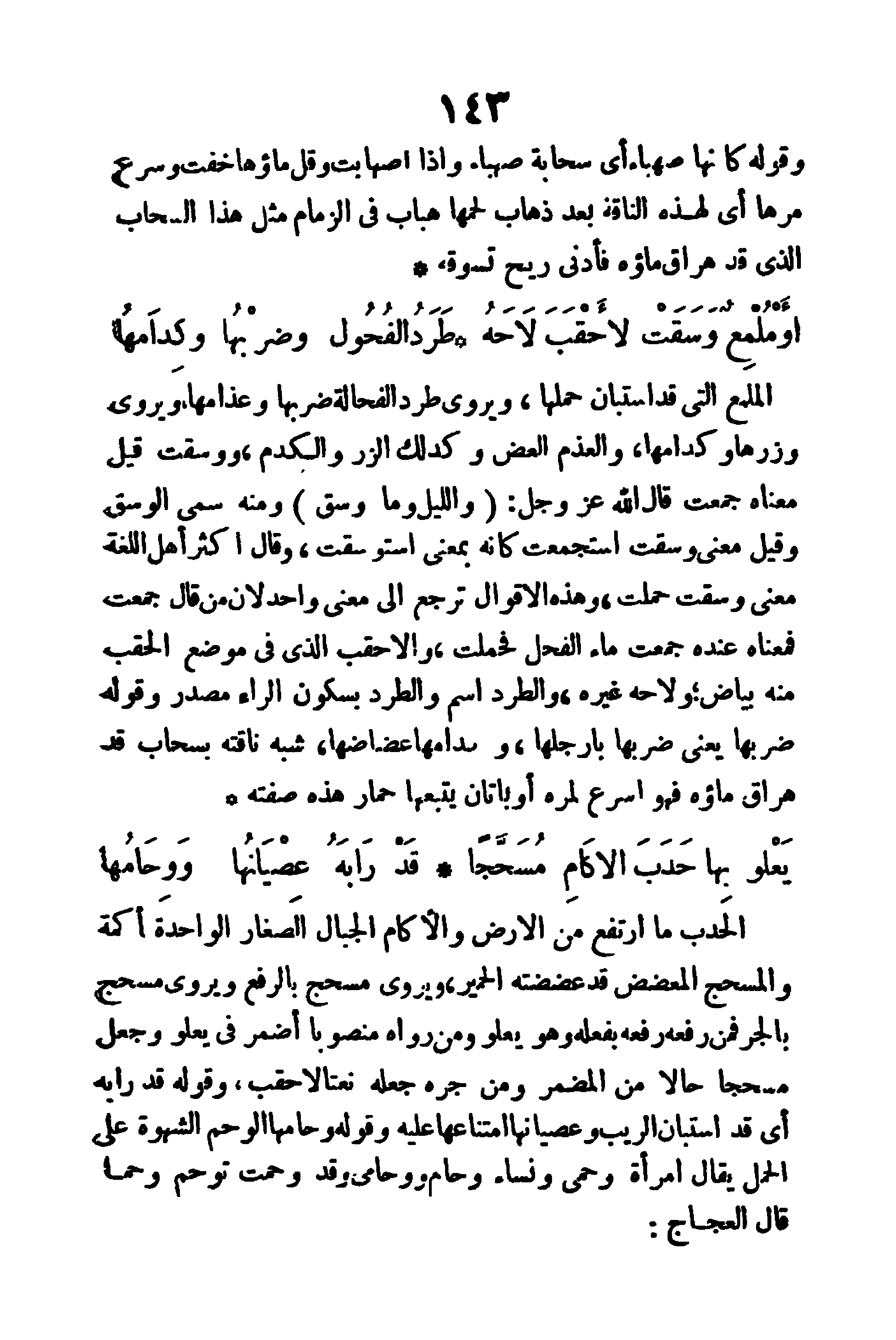 الحدب: ما ارتفع من الأرض، والإكام: الجبال الصغار، الواحدة أكمة، والمسحج: المعضض قد عضضته الحمير، ويروى (مسحَّجٌ) بالرفع، ويروى (مسحجٍ) بالجر؛ فمن رفعه رفعه بفعله وهو يعلو، ومن رواه منصوبا أضمر في يعلو، وجعل مسحجا حالا من المضمر، ومن جره جعله نعتا لأحقب، وقوله (قد رابه) أي قد استبان الريب، وعصيانها: امتناعها عليه، وقوله: (وحامها) الوحم: الشهوة على الحمل، يقال: امرأة وحمى، ونساء وحام ووحامى، وقد وحمت توحم وحما، قال العجاج: