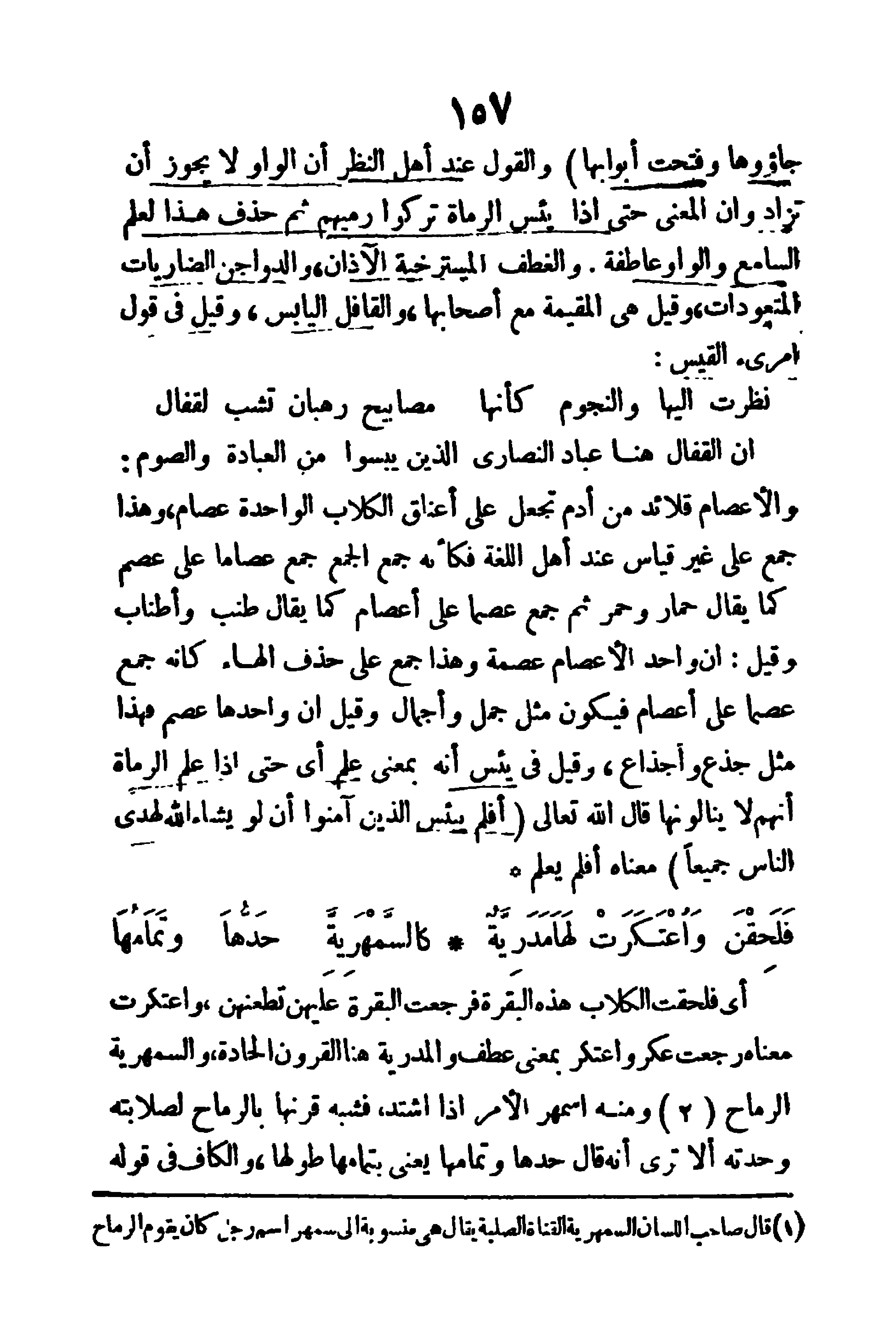 إن القفال هنا عُباد النصارى الذين يبسوا من العبادة والصوم، والأعصام: قلائد من أدم تجعل على أعناق الكلاب، الواحدة عصام، وهذا جمع على غير قياس عند أهل اللغة، فكأنه جمع الجمع، جمع عصاما على عصم، كما يقال حمار وحُمُر، ثم جمع عُصُما على أعصام كما يقال طنُب وأطناب، وقيل: أن واحد الأعصام عصمة، وهذا جمع على حذف الهاء، كأنه جمع عصما على أعصام فيكون مثل حمل وأحمال، وقيل: أن واحدها عصم، فهذا مثل جذع وأجذاع، وقيل في يئس: إنه بمعنى علم، أي حتى إذا علم الرماة أنهم لا ينالونها، قال الله تعالى: (أَفَلَمْ يَيْئَسِ الّذِينَ آمَنُوا أن لَوْ يَشَاءُ الله لَهَدَى النَّاسَ جَمِيعاً) معناه أفلم يعلم.