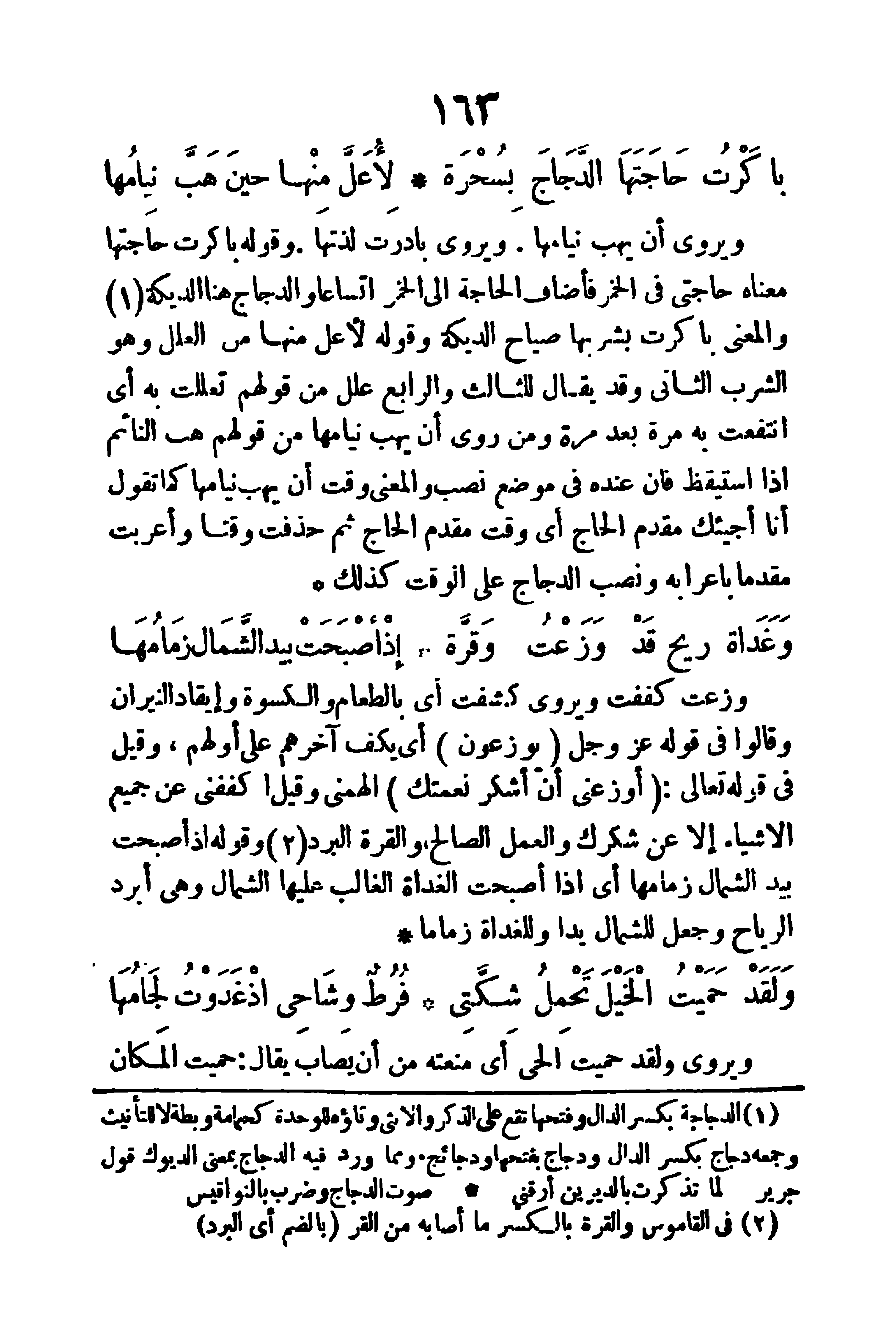 ويروى (أن يهب نيامُها) ويروى (بادرت لذتها) وقوله (باكرت حاجتها) معناه حاجتي في الخمر، فأضاف الحاجة إلى الخمر اتساعا، والدجاج هنا: الديكة والمعنى باكرت بشربها صياح الديكة، وقوله (لأعلَّ منها) من العلل وهو الشرب الثاني، وقد يقال للثالث والرابع عَلَل، من قولهم (تعَلَّلتُ به) أي انتفعت به مرة بعد مرة، ومن روى (أن يهبَّ نيامها) من قولهم (هبَّ النائم) إذا استيقظ، فإن عنده في موضع نصب، والمعنى وقت أن يهب نيامها، كما تقول: أنا أجيئك مَقْدَمَ الحاج، أي وقت مقدم الحاج، ثم حذفت وقتاً وأعربت مقدما بإعرابه، ونصب الدجاج على الوقت كذلك.