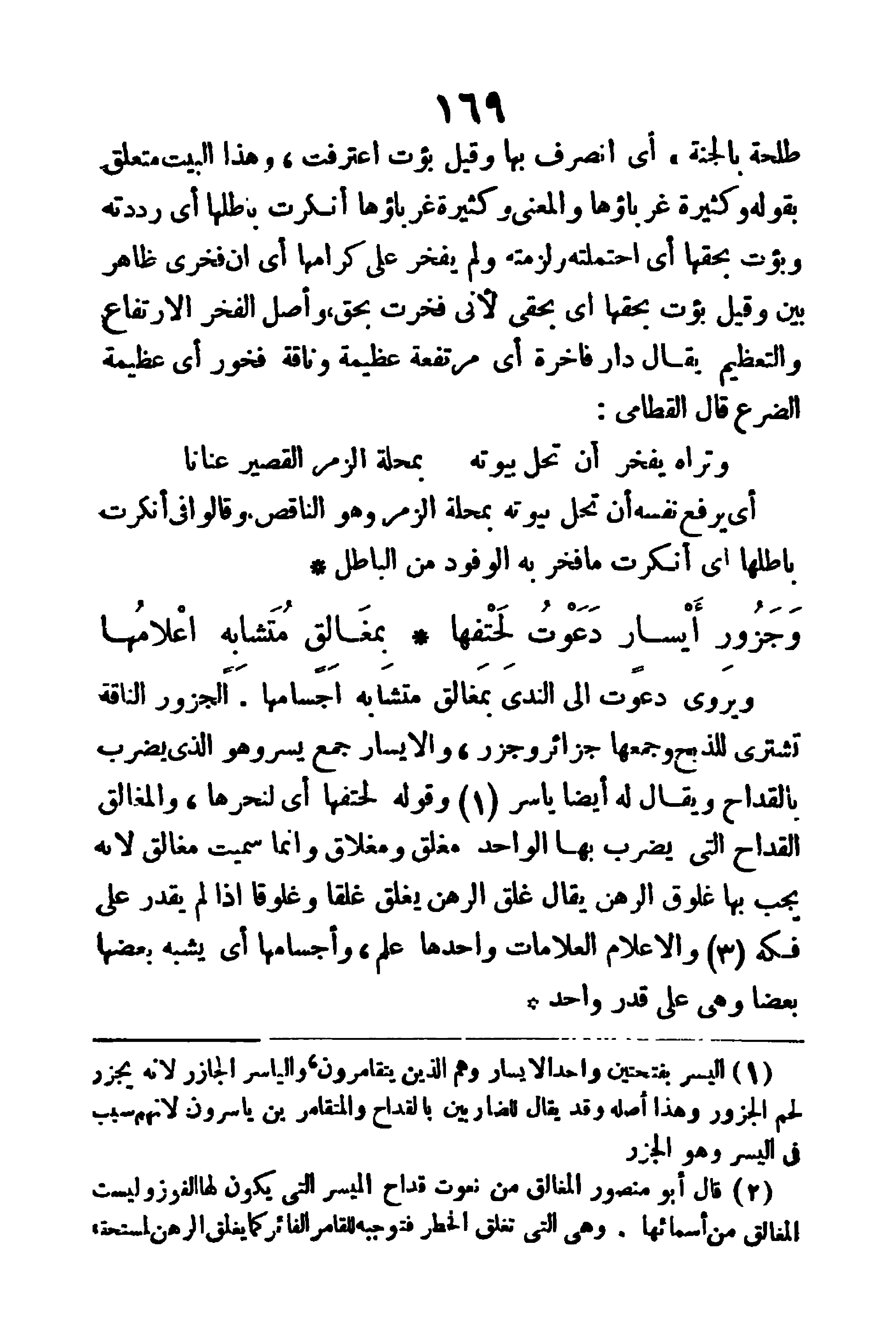 الجزور: الناقة تشتري للذبح، وجمعها جزائر وجزر، والأيسار: جمع يسر، وهو الذي يضرب بالقداح، ويقال له أيضا ياسر، وقوله (لحتفها) أي لنحرها، والمغالق: القداح التي يُضرب بها، الواحد مِغلق ومغلاق، وإنما سميت مغالق لأنه يجب بها غلوق الرهن، يقال: غلق الرهن يغلق غلقا وغلوقا؛ إذا لم يقدر على فكه، والأعلام: العلامات، واحدها علم، و (متشابه أجسامها) أي يشبه بعضها بعضا وهي على قدر واحد.