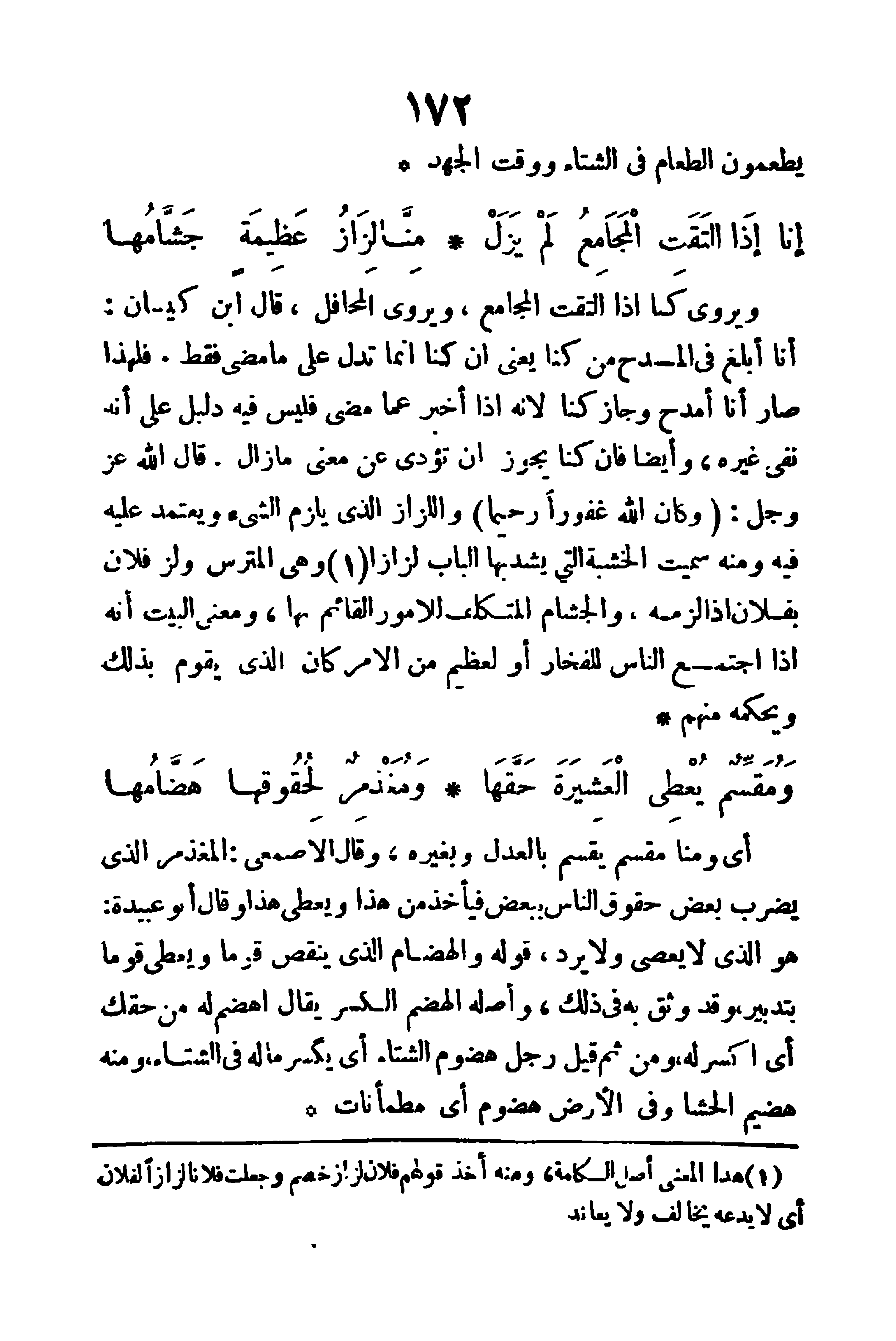 ويروى (كُنَّا إذا التقت المجامع) ويروى (المحافل)، قال ابن كيسان: إنَّا أبلغ في المدح من كنا، يعني أن كنا إنما تدل على ما مضى فقط؛ فلهذا صار إنَّا أمدح، وجاز كنا لأنه إذا أخبر عما مضى فليس فيه دليل على إنه نفى غيره، وأيضا فإن كنا يجوز أن تؤدي عن معنى ما زال، قال الله عز وجل: (وكَانَ اللهُ غَفُوراً رَحِيماً)، واللزاز: الذي يلزم الشيء ويعتمد عليه فيه، ومنه سُميت الخشبة التي يُشد بها الباب لزازا أو هي المترس، ولز فلان بفلان؛ إذا لزمه، والجشام: المتكلف للأمور القائم بها.