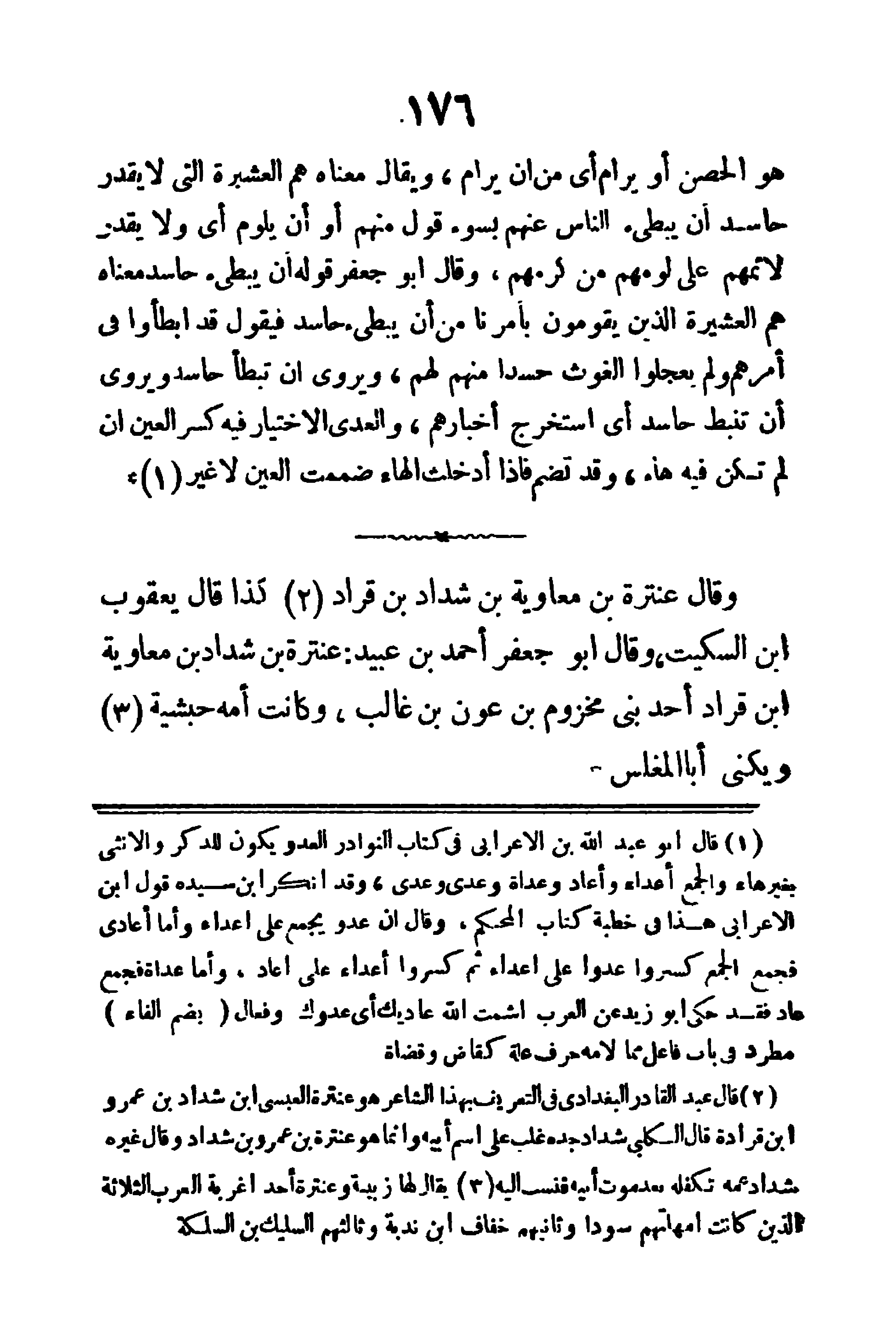 وقال عنترة بن معاوية بن شداد بن قُراد، كذا قال يعقوب بن السكيت، وقال أبو جعفر أحمد بن عبيد: عنترة بن شداد بن معاوية بن قُراد أحد بني مخزوم بن عوف بن غالب، وكانت أمه حبشية ويكنى أبا المغلس: