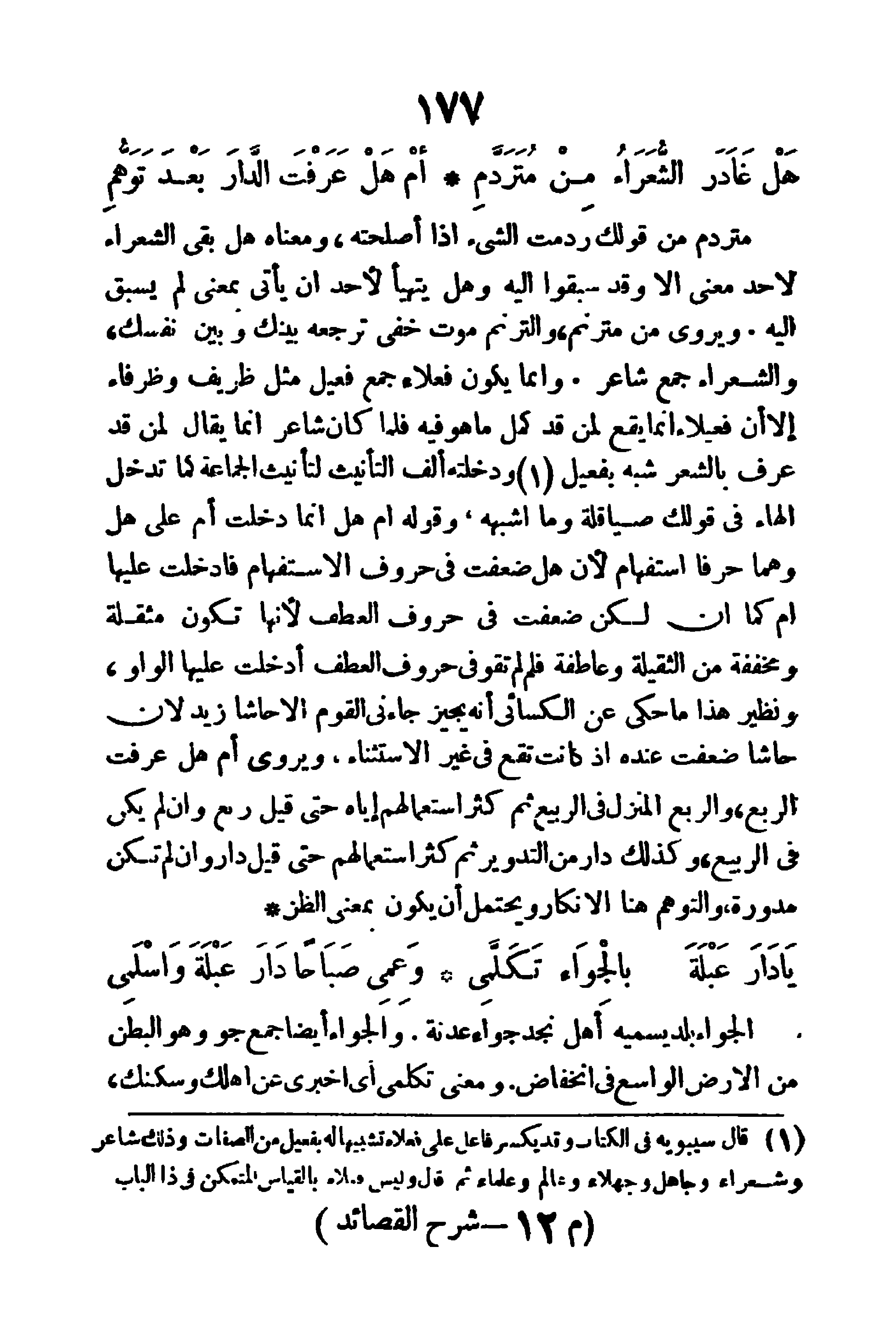 مُتردم: من قولك (ردمت الشيء) إذا أصلحته، ومعناه هل بقي الشعراء لأحد معنى إلا وقد سبقوا إليه؟ وهل يتهيأ لأحد أن يأتي بمعنى لم يُسبق إليه؟ ويروى من (مترنم) والترنم: صوت خفي ترجعه بينك وبين نفسك، والشعراء: جمع شاعر، وإنما يكون فُعلاء جمع فعيل مثل ظريف وظرفاء، إلا أن فعيلا إنما يقع لمن قد كمل ما هو فيه، فلما كان شاعر إنما يقال لمن قد عرف بالشعر شُبِّه بفعيل، ودخلته ألف التأنيث لتأنيث الجماعة، كما تدخل الهاء في قولك صياقلة وما أشبهه، وقوله (أم هل) إنما دخلت أم على هل وهما حرفا استفهام لأن هل ضعُفت في حروف الاستفهام فأدخلت عليها أم، كما أن لكن ضعفت في حروف العطف لأنها تكون مُثقلة ومخففة من الثقيلة وعاطفة، فلما لم تقو في حروف العطف أدخلت عليها الواو، ونظير هذا ما حكى عن الكسائي إنه يجيز (جاءني القوم إلا حاشا زيد) لأن حاشا ضعفت عنده إذ كانت تقع في غير الاستثناء، ويروى (أم هل عرفت الربع) والربع: المنزل في الربيع، ثم كثر استعمالهم غياه حتى قيل (ربع) وإن لم يكن في الربيع، وكذلك دار من التدوير، ثم كثر استعمالهم حتى قيل دار وإن لم تكن مدورة، والتوهم هنا: الإنكار، ويحتمل أن يكون بمعنى الظن.
