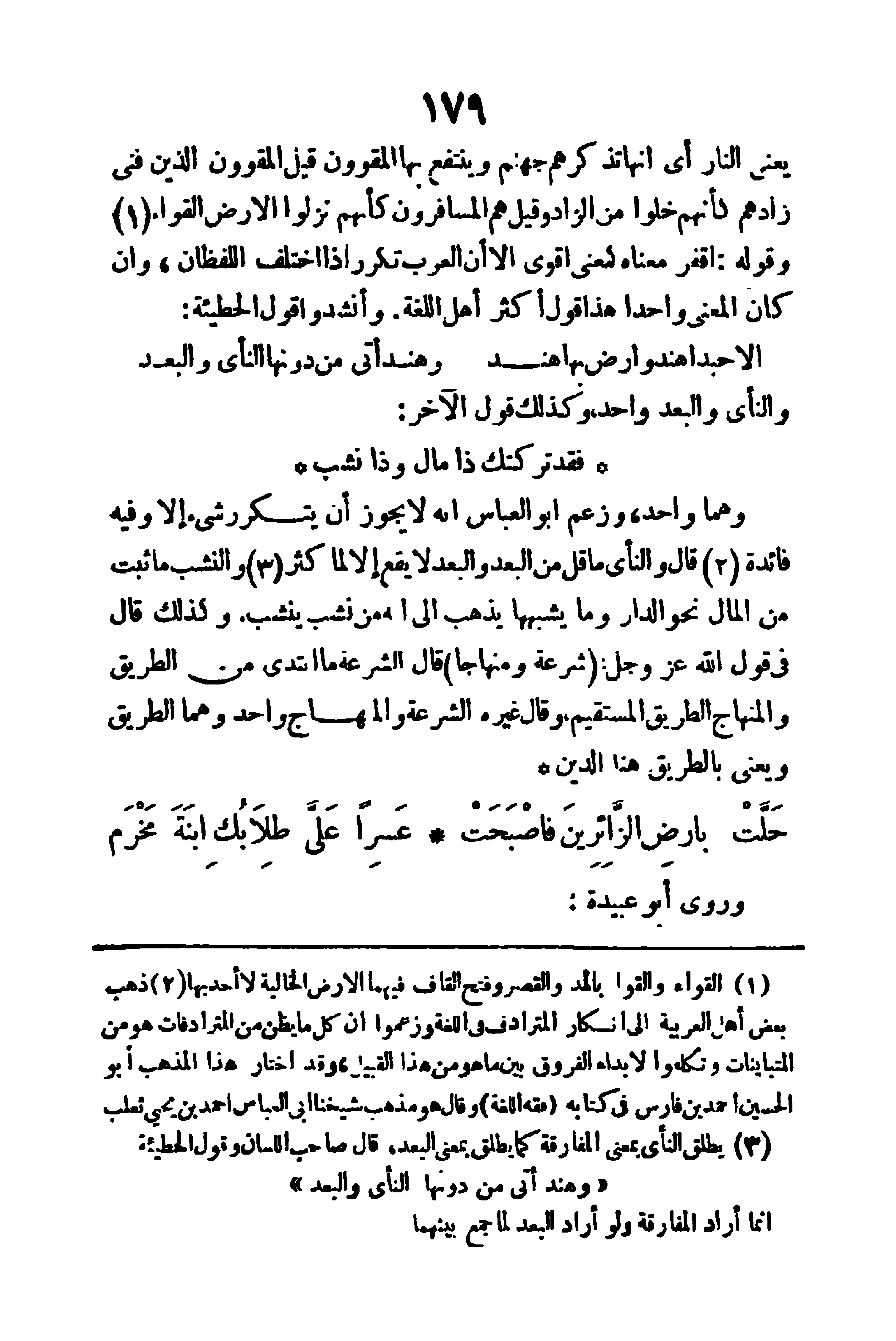 وهما واحد، وزعم أبو العباس إنه لا يجوز أن يتكرر شيء إلا وفيه فائدة، قال: والنأي ما قل من البعد، والبعد لا يقع إلا لما كثر والنشب: ما ثبت من المال نحو الدار وما يشبهها، يذهب إلى إنه من نشب ينشب، وكذلك قال في قول الله عز وجل: (شِرْعَةً وَمِنْهَاجَاً) قال: الشرعة ما ابتدئ من الطريق، والمنهاج: الطريق المستقيم، وقال غيره: الشرعة والمنهاج واحد، وهما الطريق، ويعني بالطريق هنا الدين.