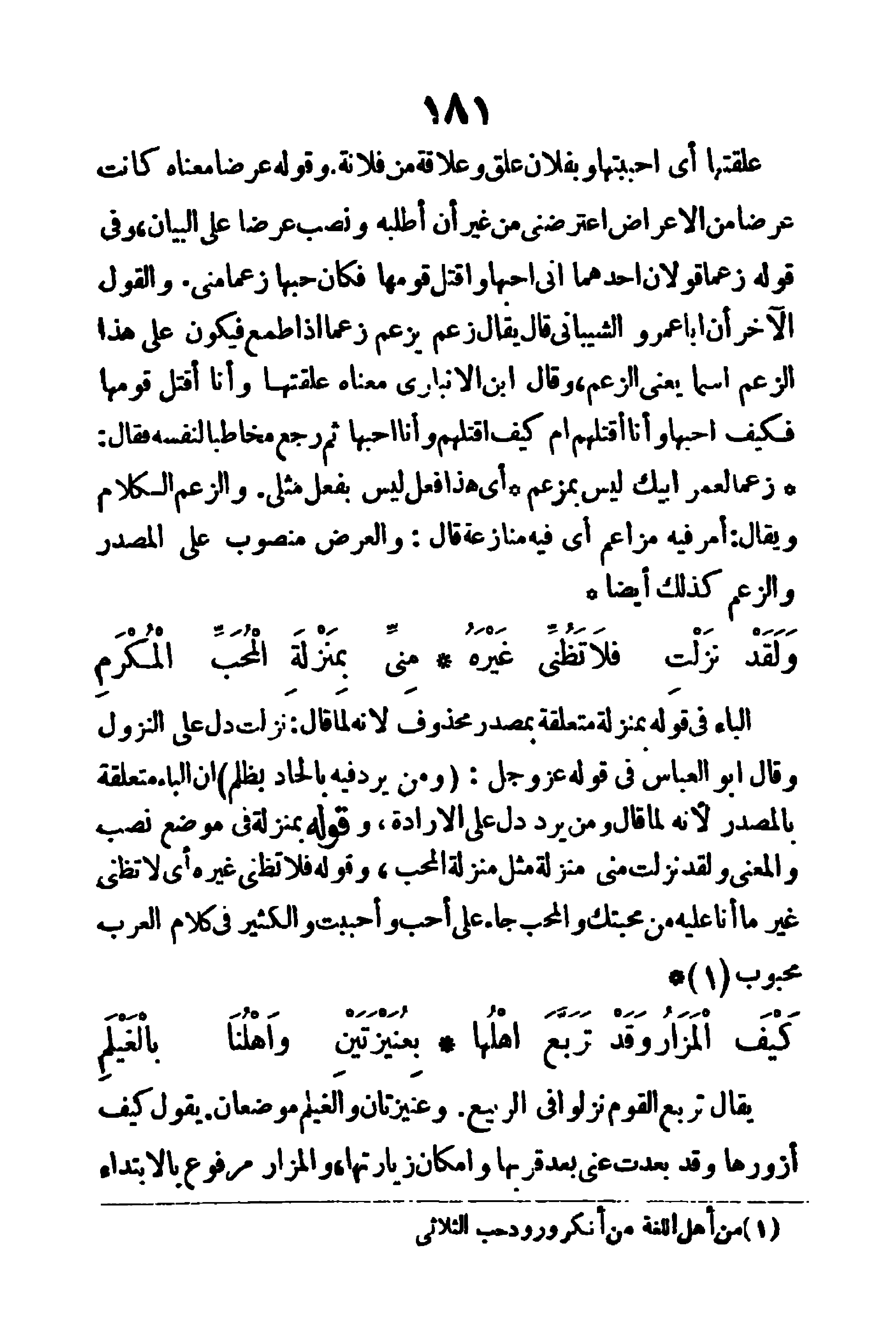 يقال (تربع القوم) نزلوا في الربيع، وعنيزتان والغيلم: موضعان يقول: كيف أزورها وقد بعدت عنى بعد قربها وإمكان زيارتها؟ والمزار: مرفوع بالابتداء