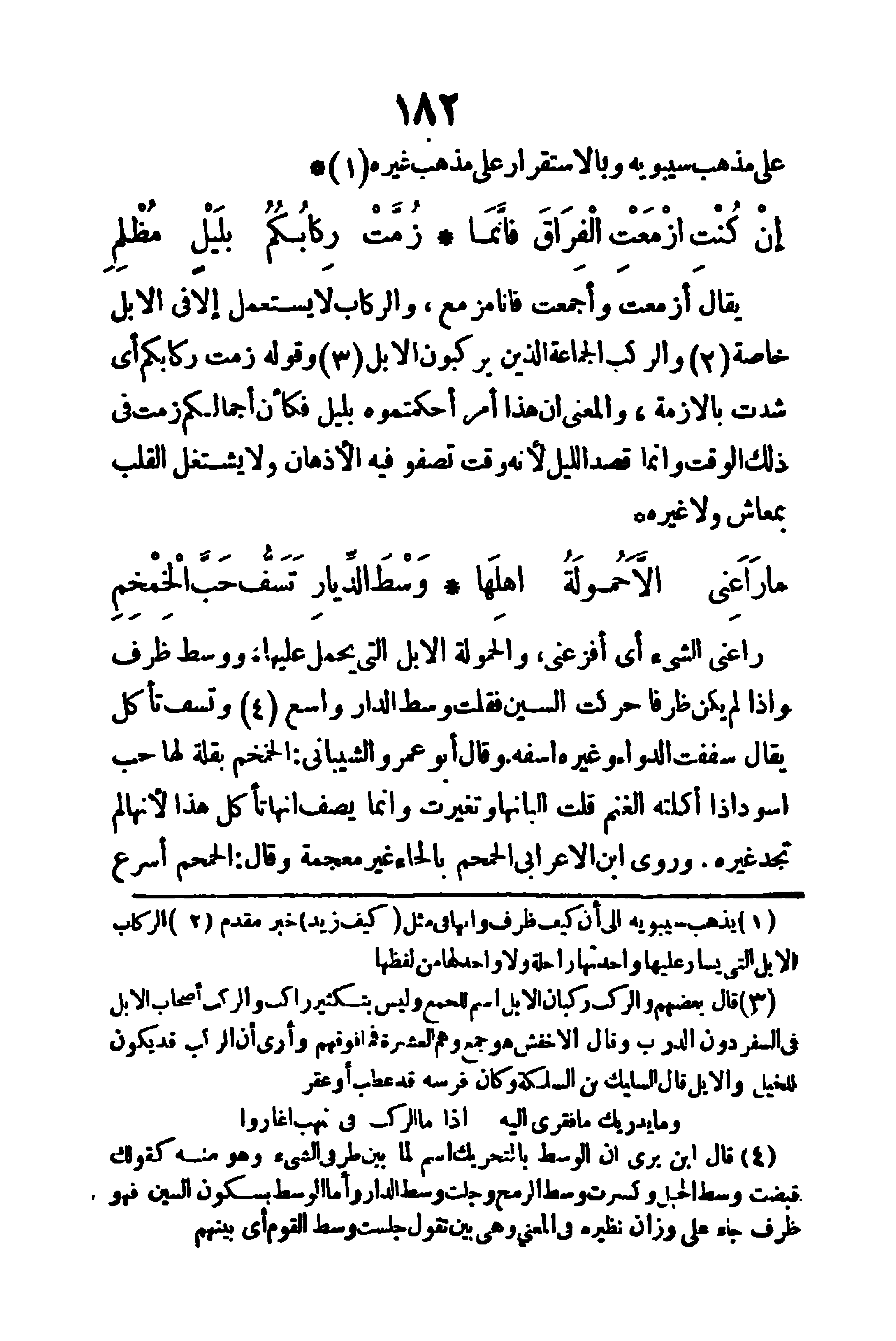 (راعني الشيء) أي أفزعني، والحمولة: الإبل التي يُحمل عليها، ووسط: ظرف؛ وإذا لم يكن ظرفا حركت السين فقلت: وسَطُ الدار واسِعٌ، وتَسَفُّ: تأكل، يقال: سففتُ الدواء وغيره أسفه، وقال أبو عمرو الشيباني: الخمخم: بقلة لها حب أسود إذا أكلته الغنم قلت ألبانها وتغيرت، وإنما يصف أنها تأكل هذا لأنها لم تجد غيره، وروى ابن الأعرابي (الحمحم) بالحاء غير معجمة، وقال: الحمحم أسرع