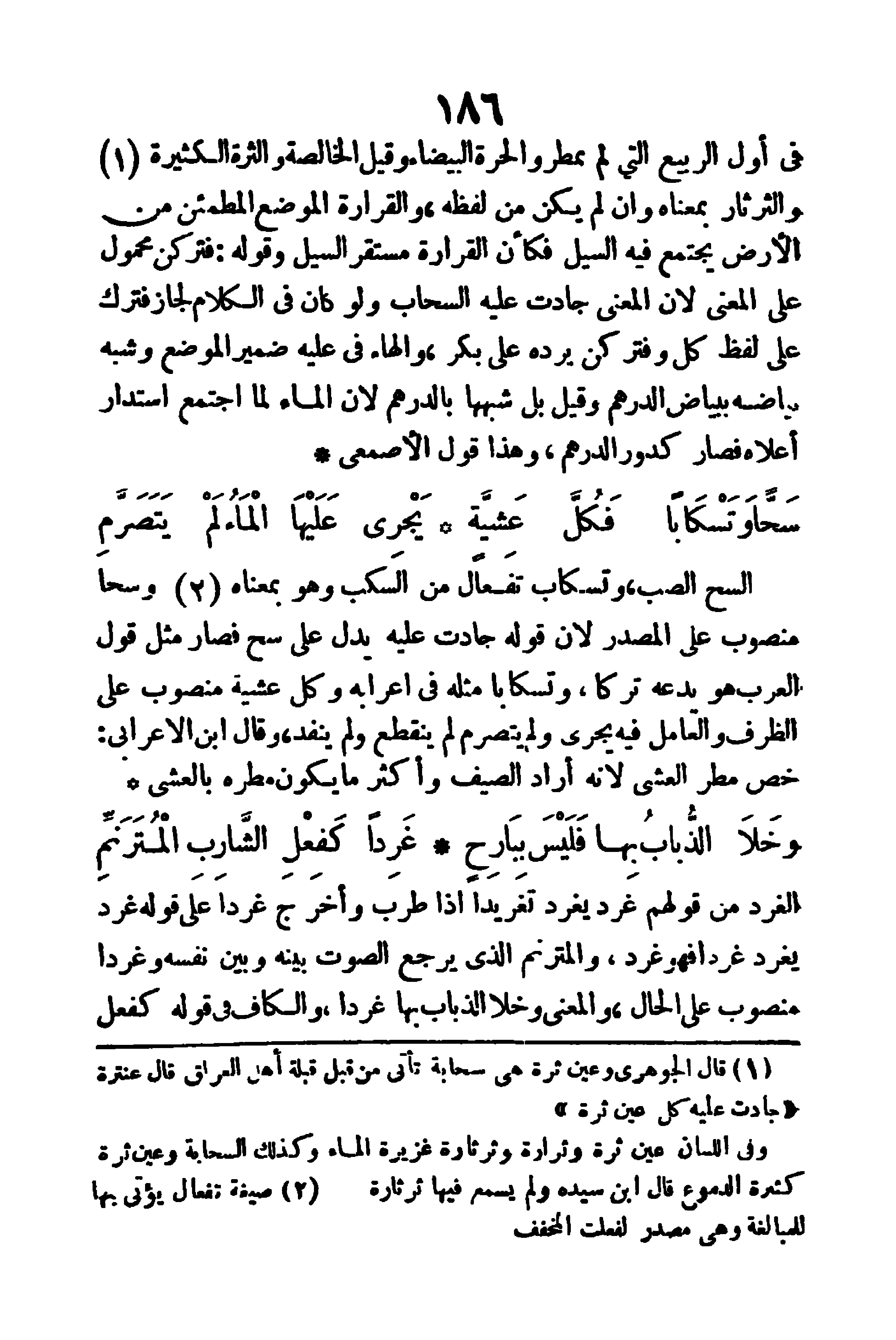 السح: الصب، وتسكاب: تفعال من السكب، وهو بمعناه وسحًّا: منصوب على المصدر؛ لأن قوله (جادت عليه) يدل على سح؛ فصار مثل قول العرب: (هو يدعه تركا)، وتسكابا مثله في إعرابه، وكل عشية: منصوب على الظرف، والعامل فيه يجري، ولم يتصرم: لم ينقطع ولم ينفد، وقال ابن الأعرابي: خص مطر العشي لأنه أراد الصيف، وأكثر ما يكون مطره بالعشي.
