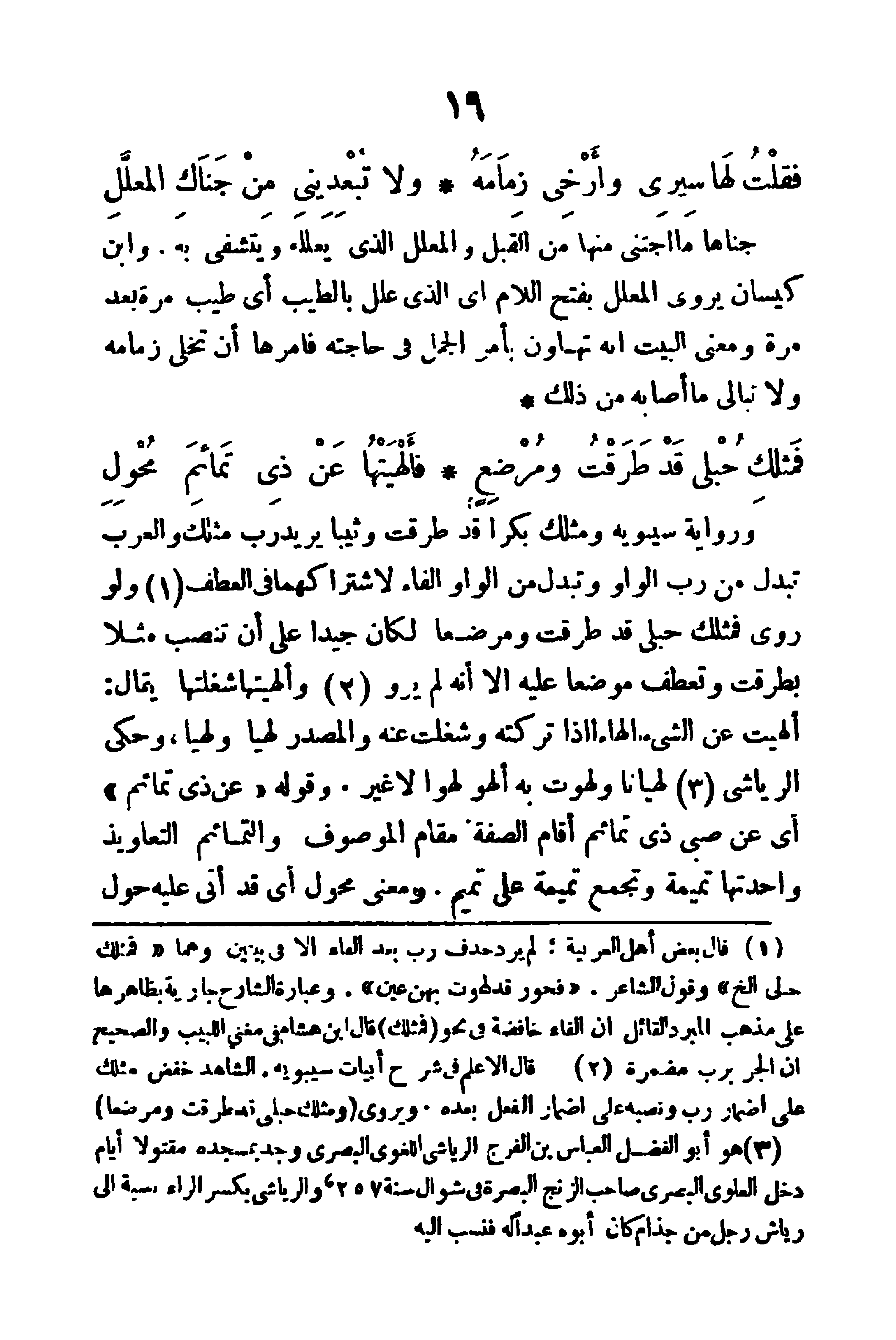 ورواية سيبويه (ومثلك بكرا قد طرقت وثيبا) يريد رُبَّ مثلك، والعرب تبدل من ربَّ الواو، وتبدل من الواو الفاء لاشتراكهما في العطف، ولو روى (فمثلك حُبلى قد طرقت ومرضعا) لكان جيدا، على أن تنصب مثلا بطرقت وتعطف مرضعا عليه، إلا إنه لم يُرو، وألهيتها: شغلتها، يقال: ألهيت عن الشيء إلهاءاً، إذا تركته وشُغلت عنه، والمصدر بهى ولُهيا، وحكى الرياشي لهيانا، ولهوت به ألهو لهواً لا غير، وقوله (عن ذي تمائم) أي عن صبي ذي تمائم، أقام الصفة مقام الموصوف، والتمائم: التعاويذ، واحدتها تميمة، وتجمع تميمة على تميم، ومعنى (محول) أي قد أتى عليه حول،