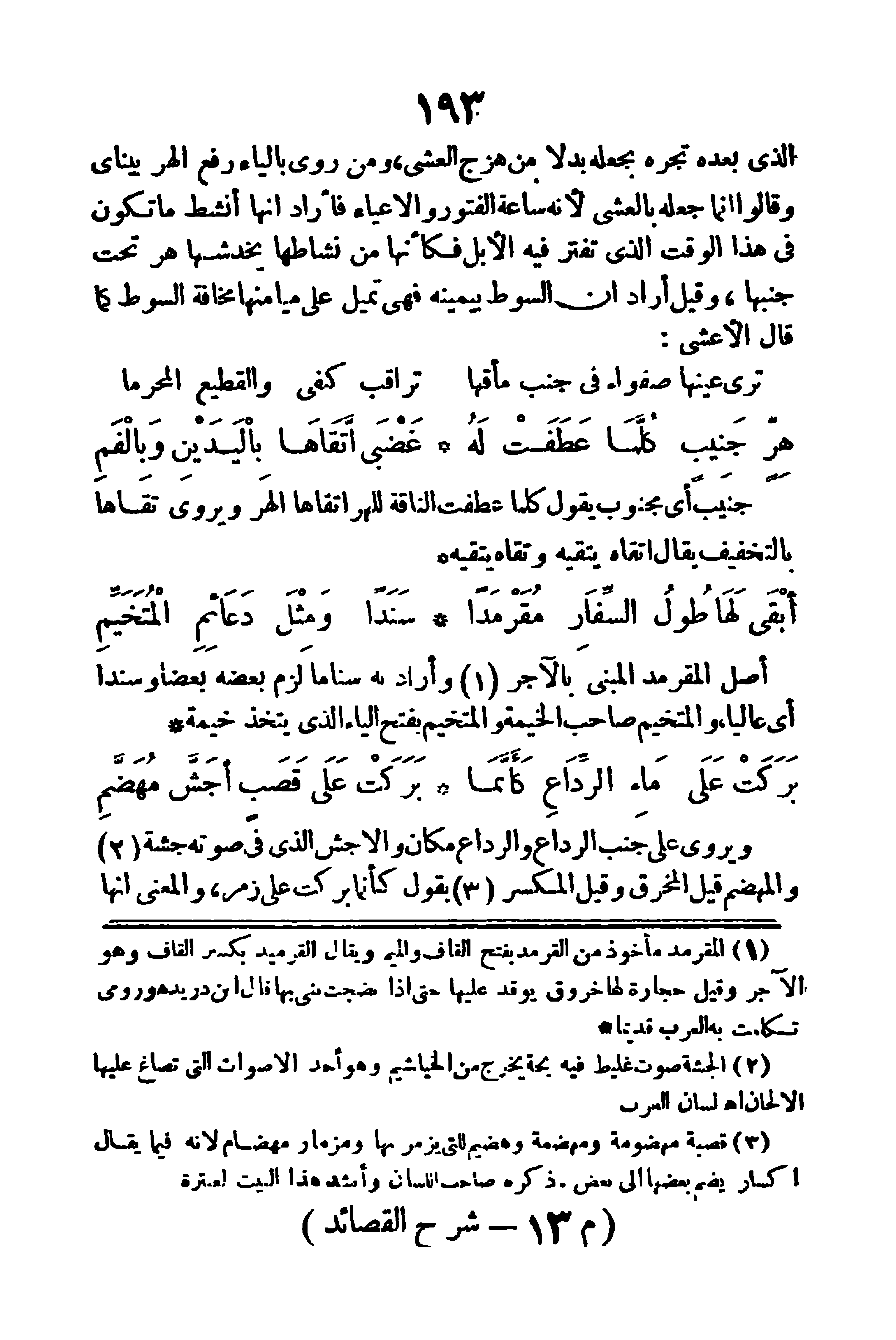 (بَرَكَتْ عَلى ماءِ الرِّداعِ، كأَنَّمَا ... بَرَكَتْ على قَصَبٍ أَجَشَّ مُهَضَّمِ)