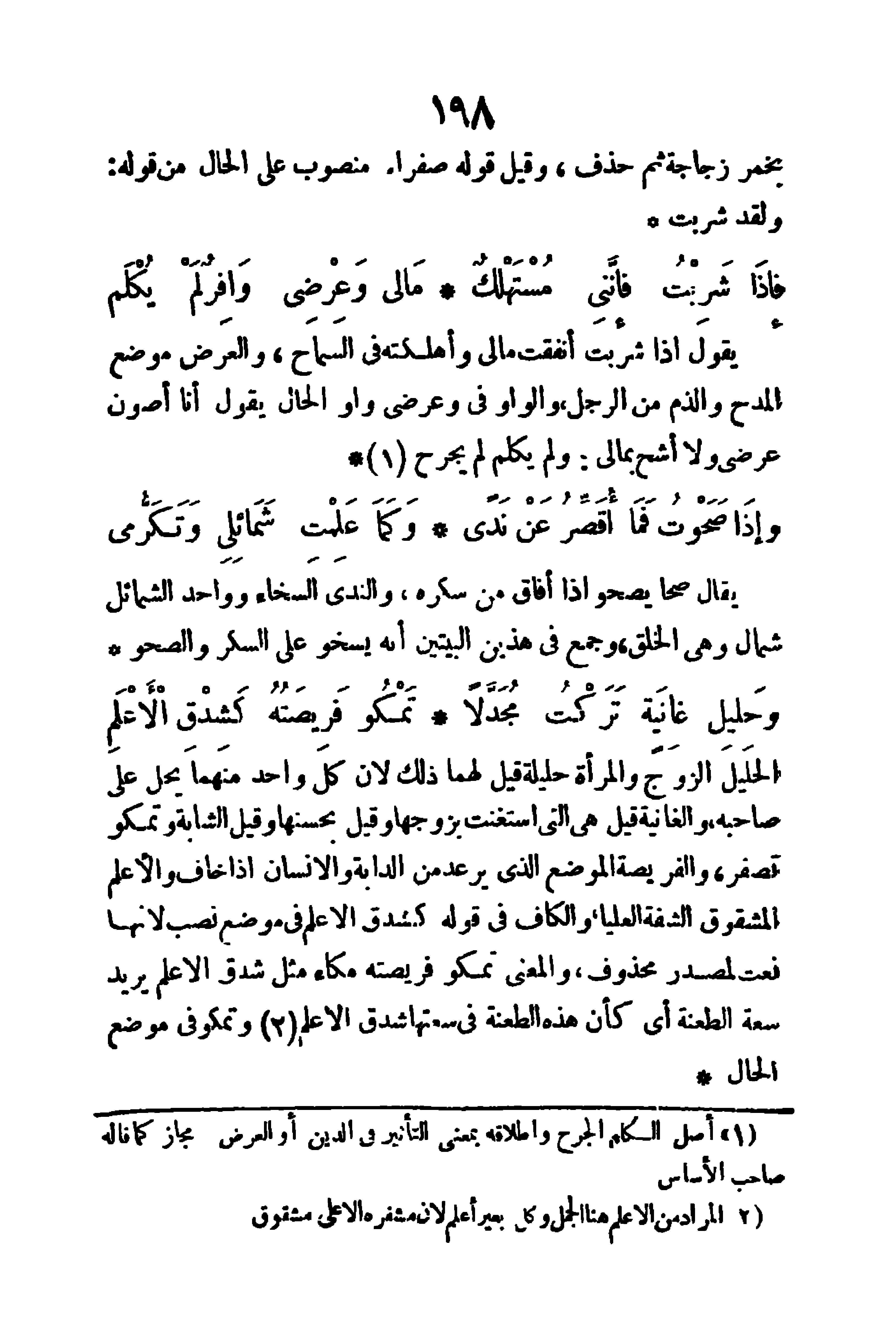 (فَإِذَا شَرِبْتُ فَإِنَّنِي مُسْتَهْلِكٌ ... مَالِي، وَعِرْضِي وَافِرٌ لَمْ يُكْلَمِ)