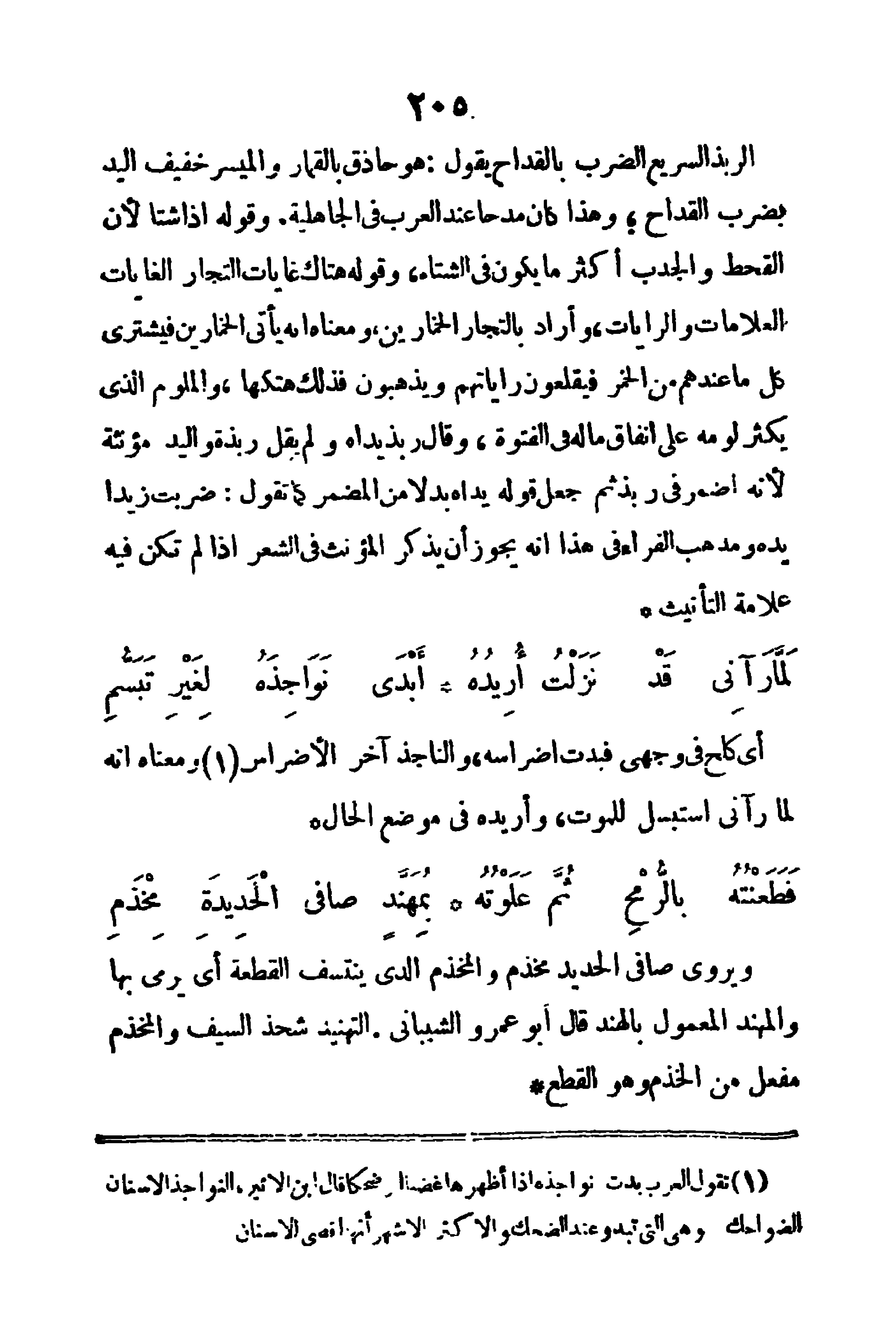 ويروى (صافي الحديد مُخذم) والمُخذم: الذي ينتسف القطعة، أي يرمى بها، والمهنَّد: المعمول بالهند، قال أبو عمرو الشيباني: التهنيد شحذُ السيف، والمِخذم: مفعل من الخذم وهو القطع.