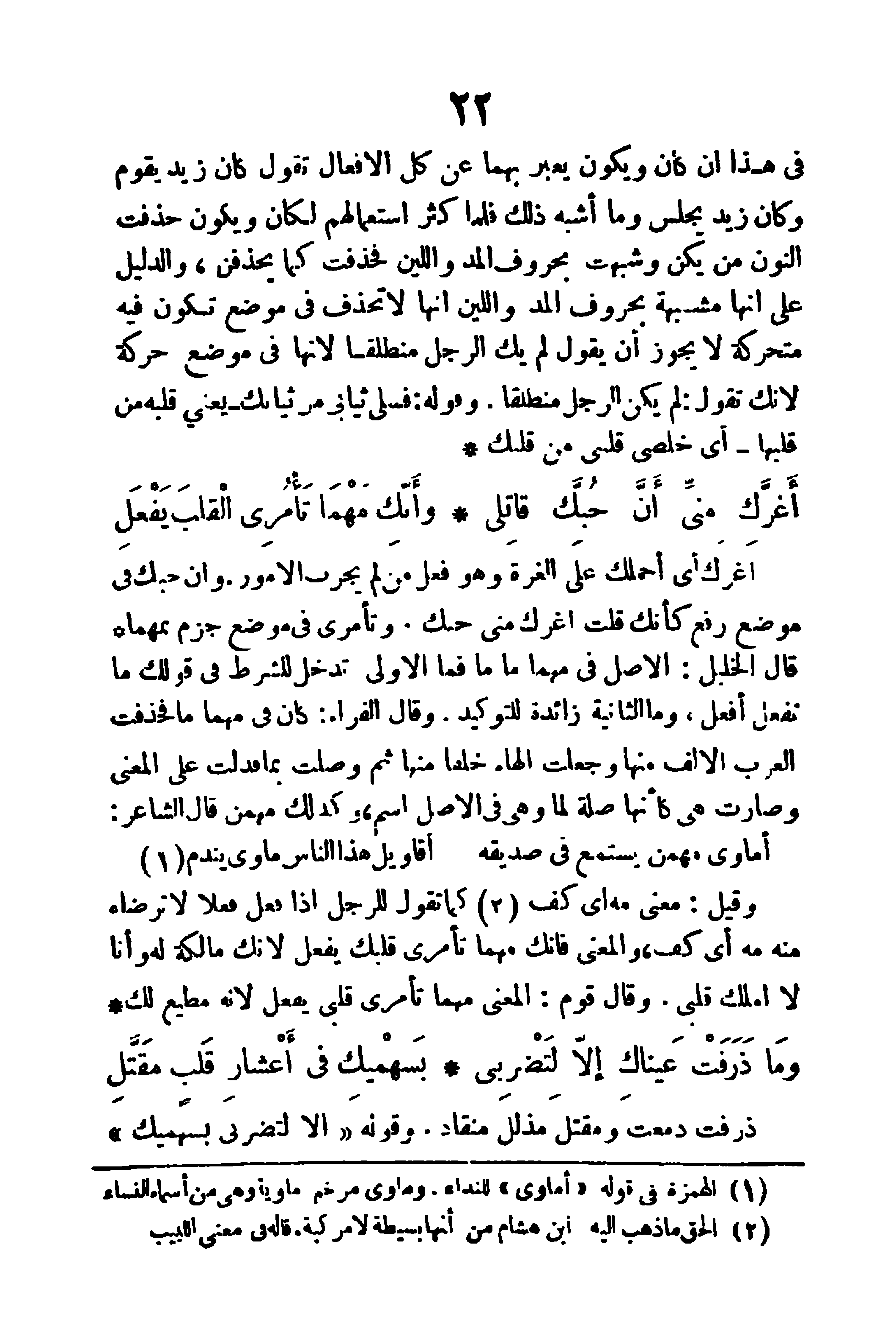 في هذا أن كان ويكون يعبَّر بهما عن كل الأفعال، تقول: كان زيد يقوم، وكان زيد يجلس، وما أشبه ذلك، فلما كثر استعمالهم لكان ويكون حذفت النون من يكن، وشبهت بحروف المد واللين فحذفت كما يحذفن، والدليل على إنها مشبهة بحروف المد واللين إنها لا تحذف في موضع تكون فيه متحركة، لا يجوز أن تقول: (لم يك الرجل منطلقا) لأنها في موضع حركة؛ لأنك تقول: لم يكن الرجل منطلقا. وقوله: (فسلي ثيابي من ثيابك) - يعني قلبه من قلبها - أي خلصي قلبي من قلبك.