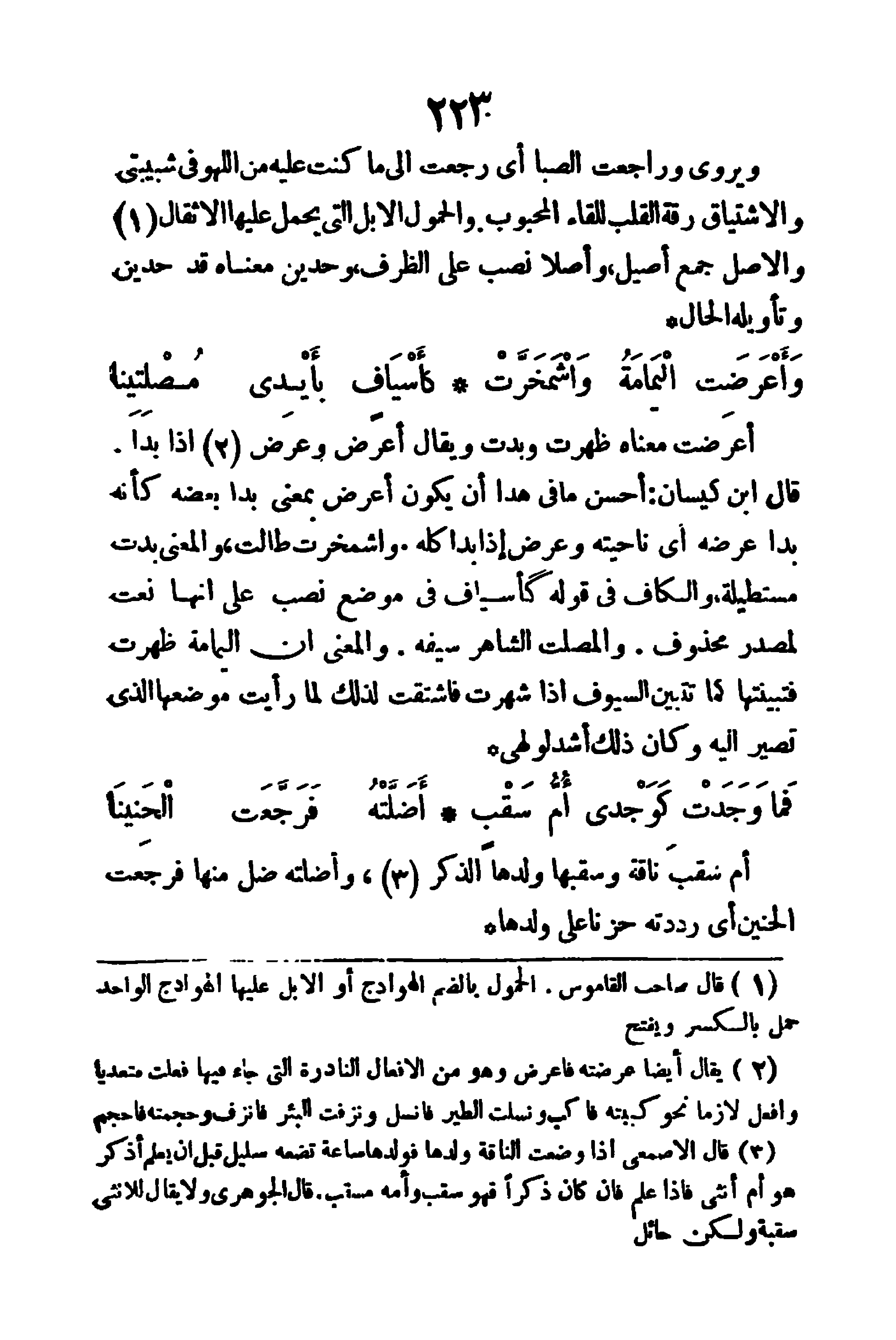 ويروى (وراجعت الصبا) أي رجعت إلى ما كنت عليه من اللهو في شبيبتي، والاشتياق: رقة القلب للقاء المحبوب، والحُمُول: الإبل التي يُحمل عليها الأثقال. والأصل: جمع أصيل، و (أُصُلا) نصب على الظرف، وحدين معناه قد حدين، وتأويله الحال.