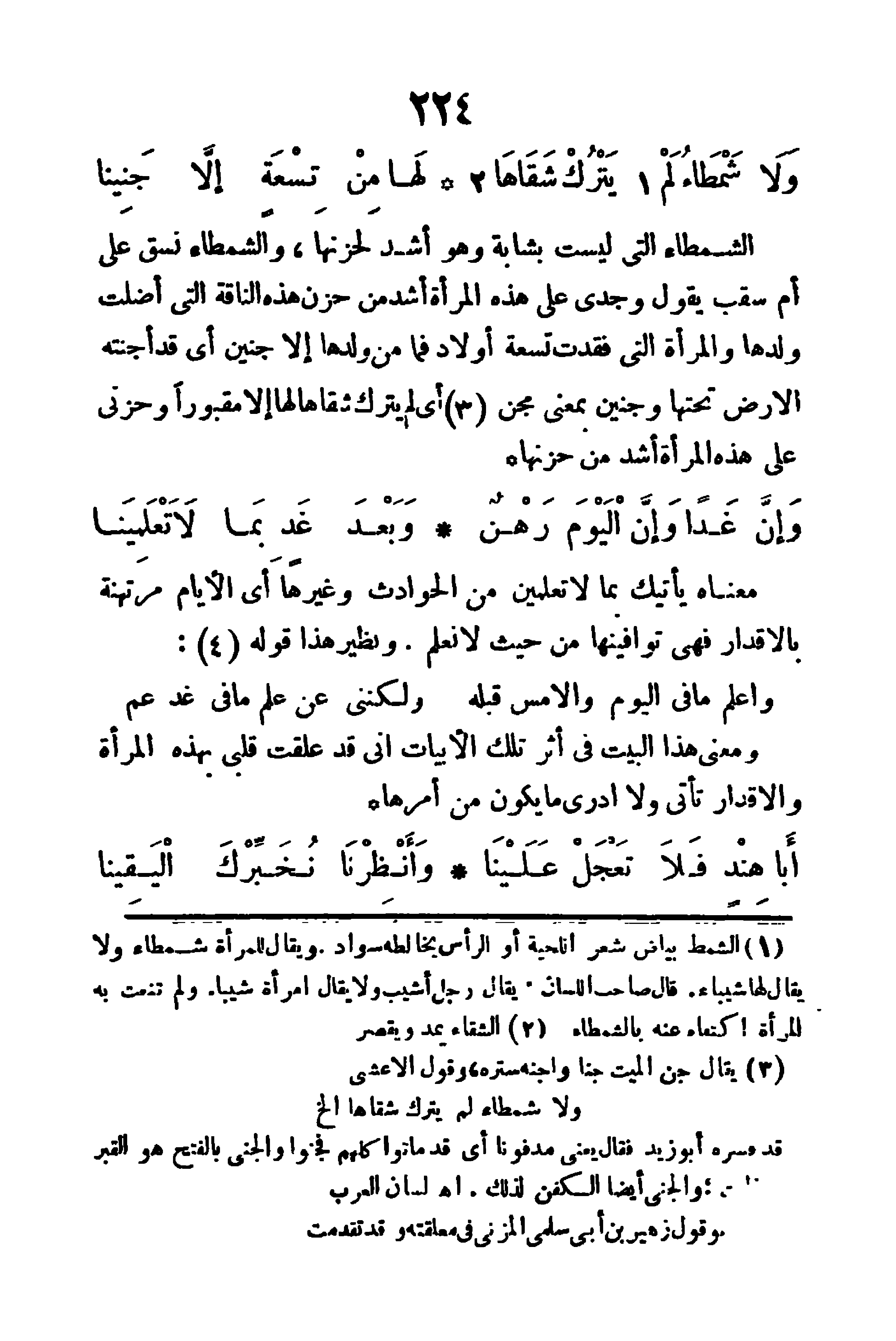 (ولاَ شَمْطَاءُ لَمْ يَتْرُكْ شَقَاهَا ... لَهَا مِنْ تِسْعَةٍ إِلاّ جَنِينَا)
