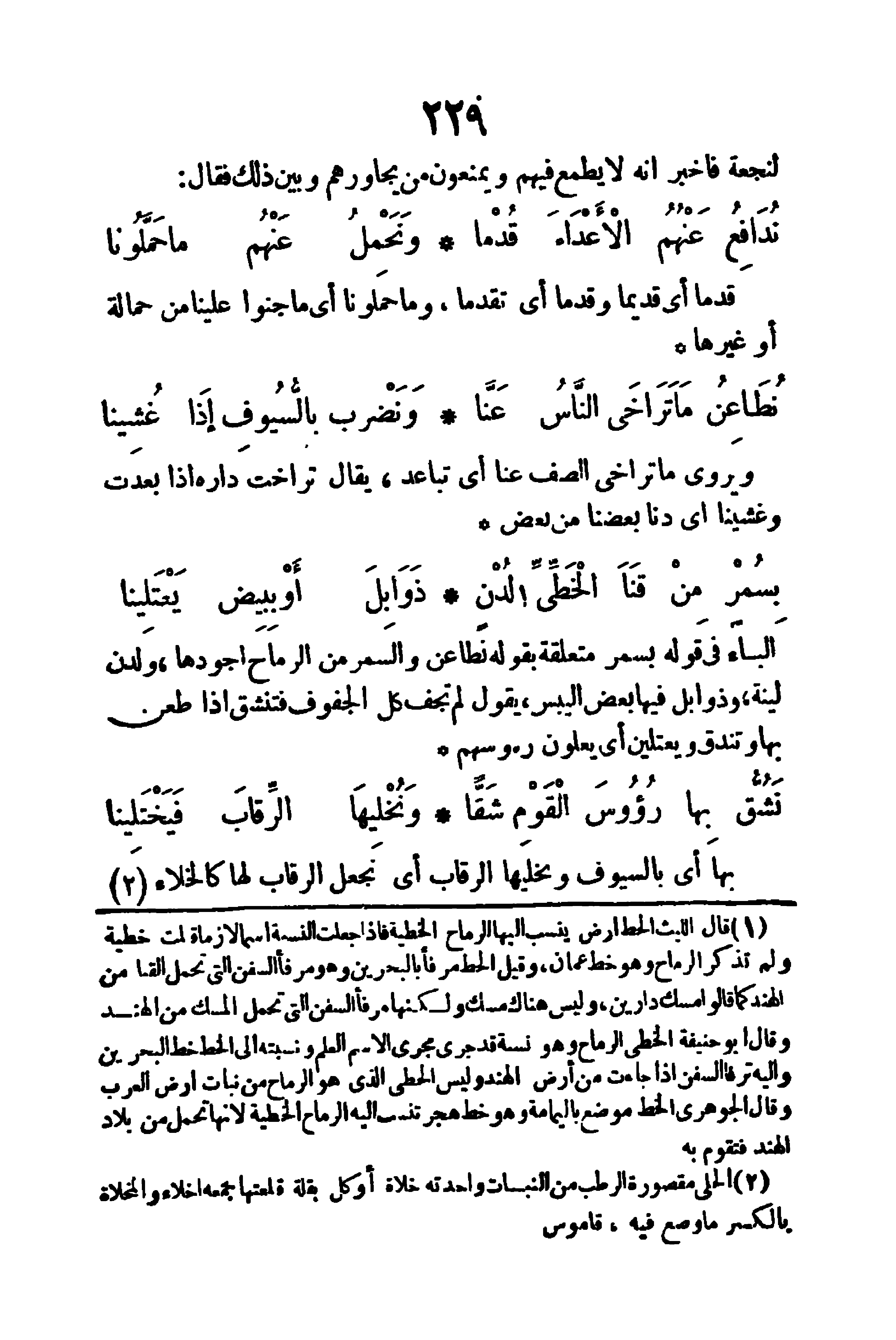 (بِسُمْرٍ مِنْ قَنَا الخَطِّىِّ لُدْنٍ ... ذَوَابِلَ أو ببِيضٍ يَعْتَلِينَا)