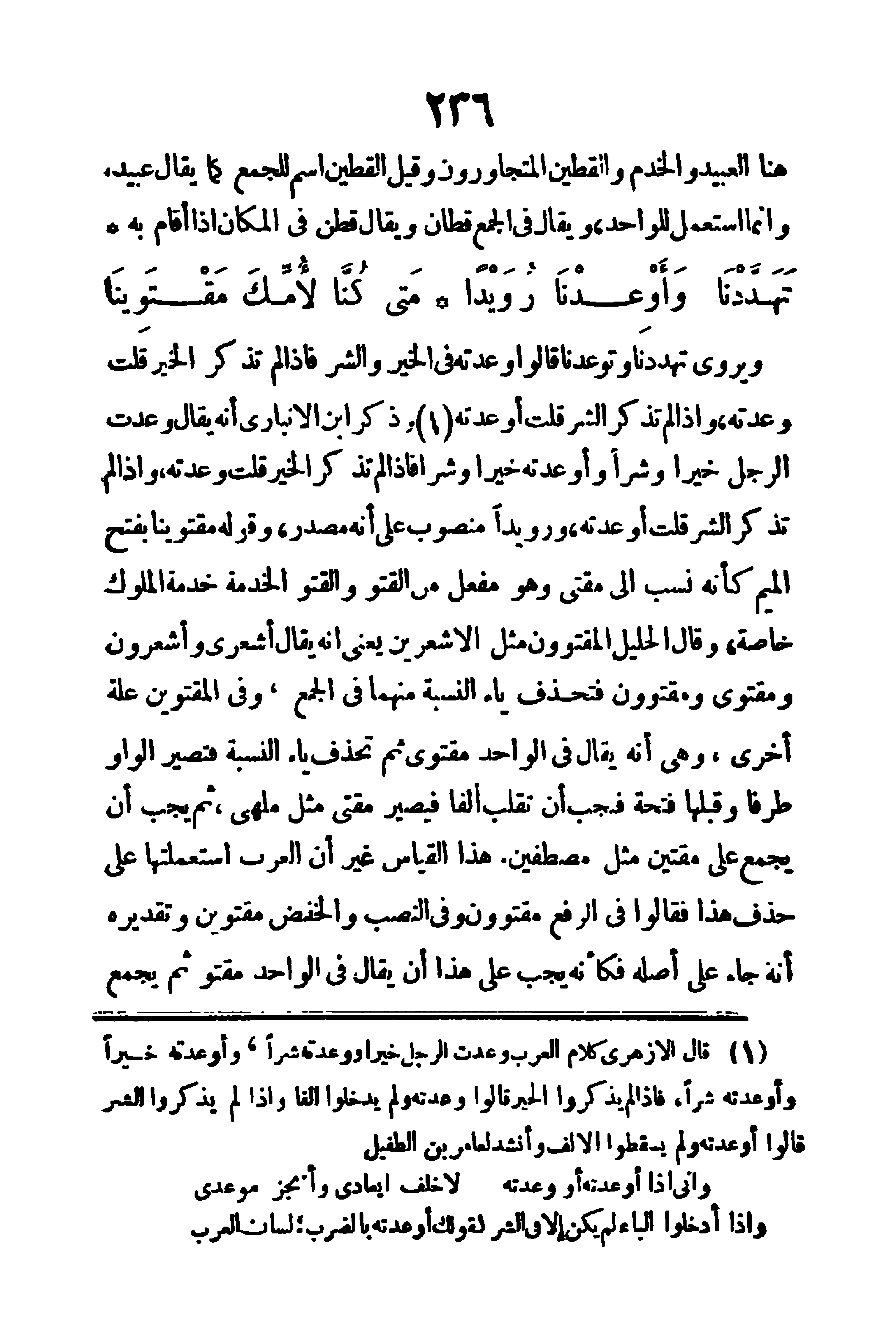 وعدت الرجل خيرا، وشرا، وأوعدته خيرا، وشرا، فإذا لم تذكر الشر قلت: أوعدته، و (رويدا) منصوب على إنه مصدر، وقوله (مَقتوينا) بفتح الميم كأنه نسب إلى مقتي وهو مفعل من القتو، والقتو: الخدمة خدمة الملوك خاصة، وقال الخليل: المقتوون مثل الأشعرين، يعني إنه يقال: أشعري وأشعرون، ومقتوي ومقتوون، فتحذف ياء النسبة منهما في الجمع، وفي المقتوين علة اخرى، وهي إنه يقال في الواحد مقتوي ثم تحذف ياء النسبة، فتصير الواو طرفا وقبلها فتحة، فيجب أن تقلب ألفا فيصير مقتى مثل ملهى، ثم يجب أن يجمع على مقتين مثل مصطفين، هذا القياس، غير أن العرب استعملتها على حذف هذا، فقالوا في الرفع: مقتوون، وفي النصب والخفض: مقتوين، وتقديره إنه جاء على أصله، فكأنه يجب على هذا أن يقال في الواحد: مقتو، ثم يجمع