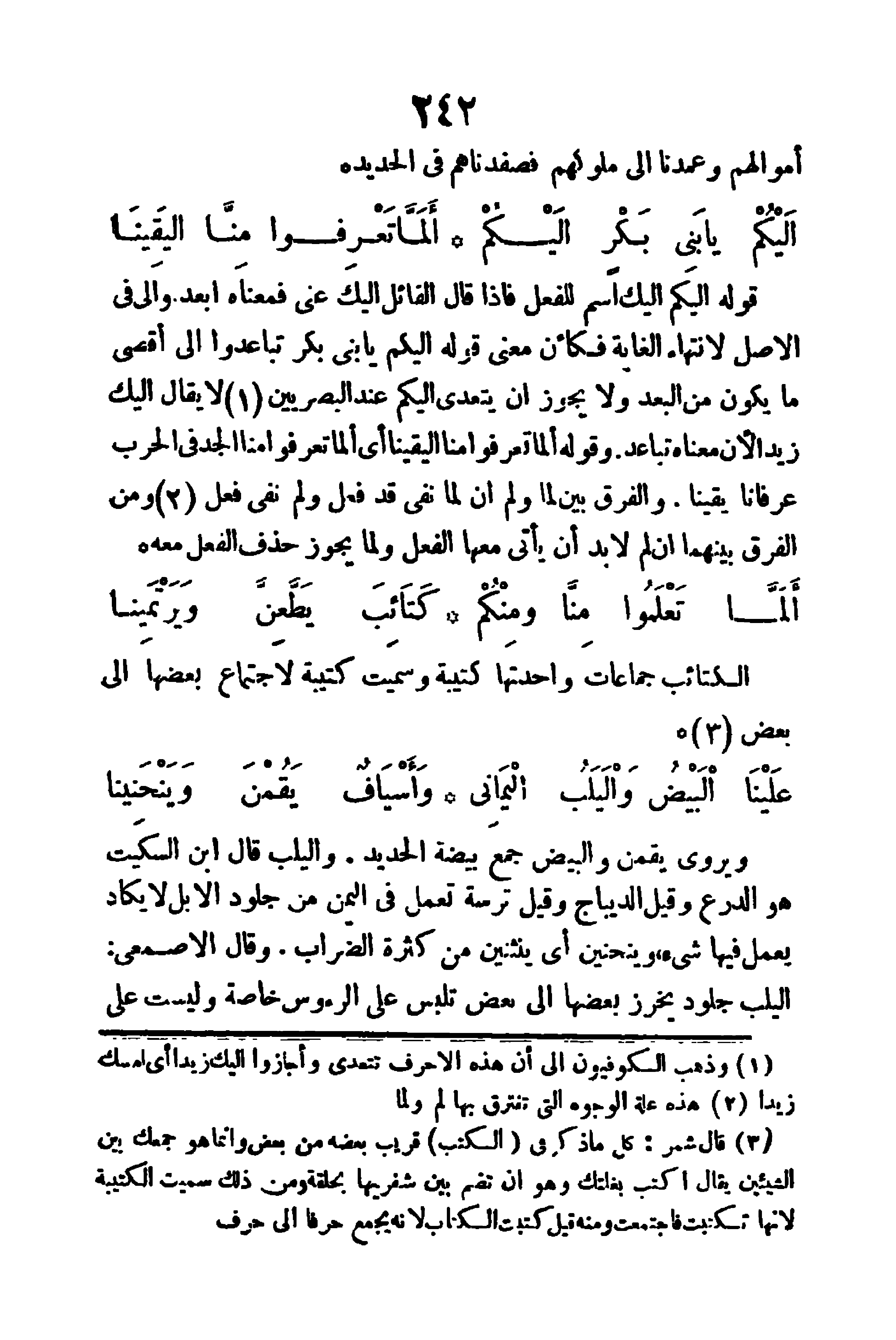 الأصل لانتهاء الغاية، فكأن معنى قوله (إليكم يا بني بكر) تباعدوا إلى أقصى ما يكون من البعد، ولا يجوز أن يتعدَّى (إليكم) عند البصريين لا يقال إليك زيدا، لأن معناه تباعد، وقوله (ألما تعرفوا منا اليقينا) أي ألما تعرفوا منا الجد في الحرب عرفانا يقينا، والفرق بين لما ولم أن لما نفي قد فعل ولم نفُى فعل، ومن الفرق بينهما أن لم لابد أن يأتي معها الفعل ولمَّا يجوز حذف الفعل معه.