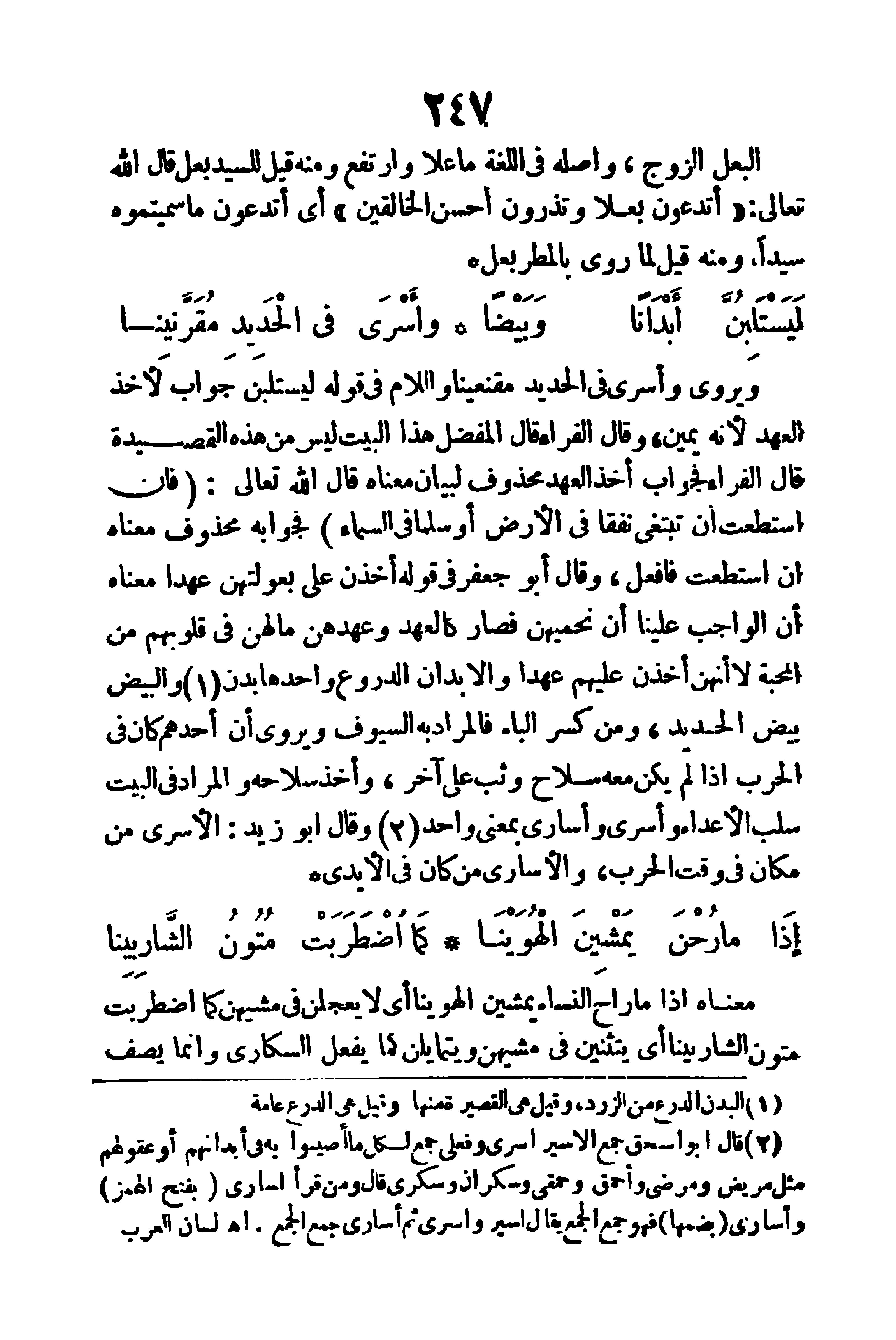 فافعل، وقال أبو جعفر في قوله (أخذن على بعولتهن عهدا) معناه أن الواجب علينا أن نحميهن فصار كالعهد، وعهدهن مالهن في قلوبهم من المحبة، لا أنهن أخذن عليهن عهدا، والأبدان: الدروع، واحدها بدن والبيض: الحديد، ومن كسر الباء فالمراد به السيوف، ويروى أن أحدهم كان في الحرب إذا لم يكن معه سلاح وثب على آخر، وأخذ سلاحه، والمراد في بيت سلب الأعداء، وأسرى وأسارى بمعنى واحد وقال أبو زيد: الأسرى من كان في وقت الحرب، والأسارى من كان في الأيدي.