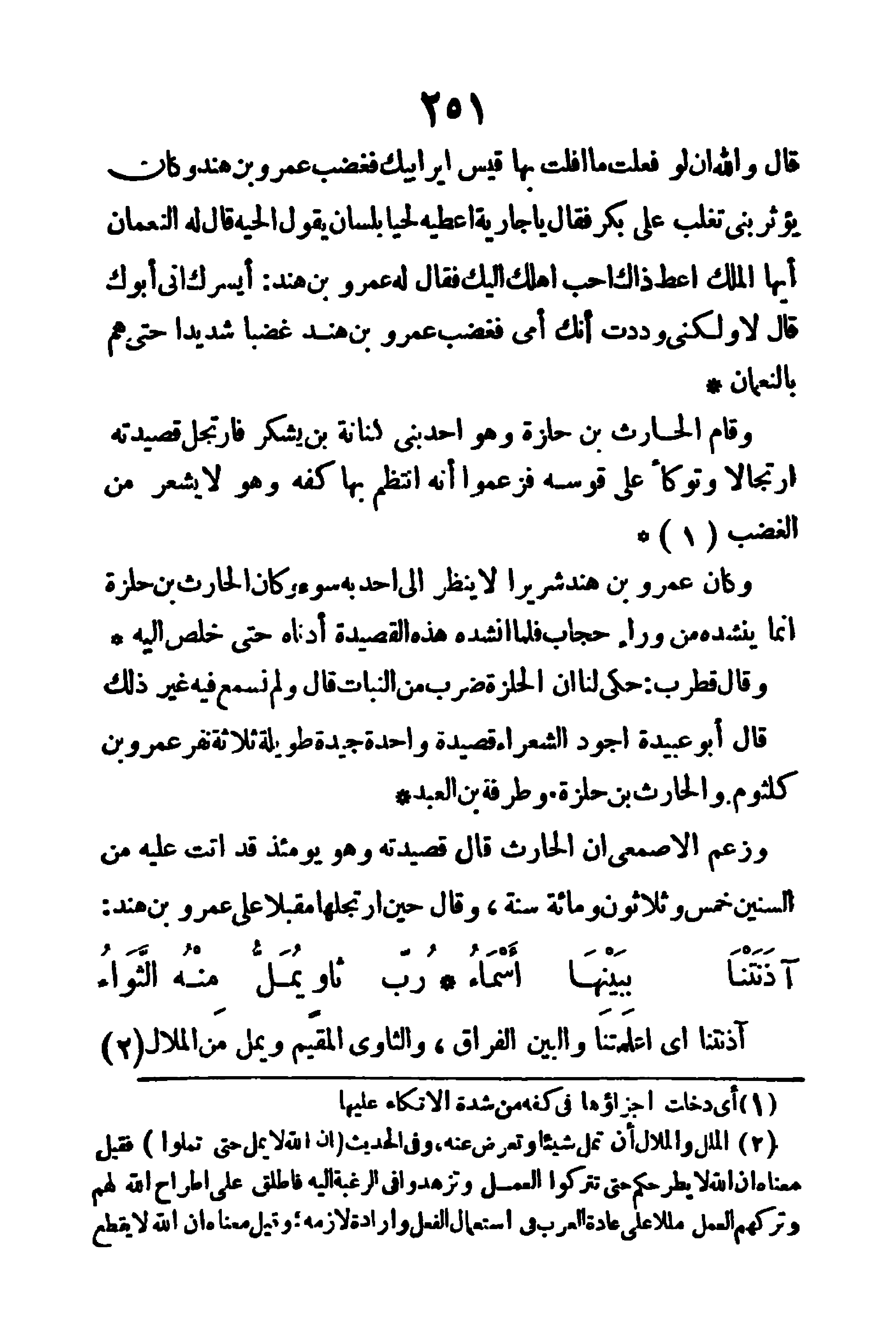 قال: والله أن لو فعلت ما أفلت بها قيس أبن أبيك، فغضب عمرو بن هند - وكان يؤثر بني تغلب على بكر - فقال: يا حارثة، أعطه لحينا بلسان أنثى، يقول الحيه، قال له النعمان: أيها الملك، أعط ذلك أحب أهلك إليك، فقال له عمرو بن هند: أيسرك أني أبوك؟ قال: لا، ولكني وددت أنك أمي، فغضب عمرو بن هند غضبا شديدا حتى هم بالنعمان.