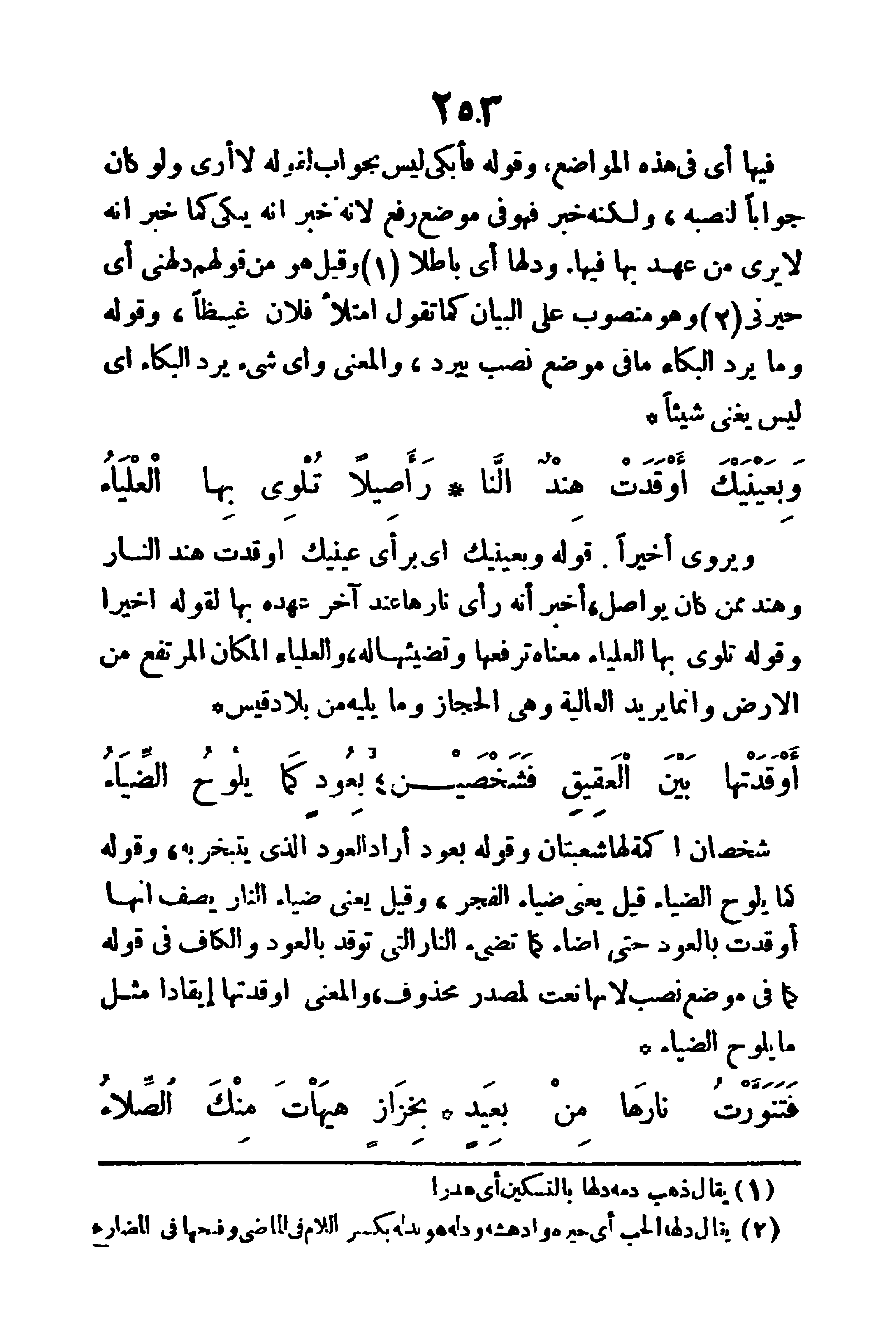ويروى (أخيرا) قوله: (وبعينيك) أي: برأي عينيك أوقدت هند النار، وهند ممن كان يواصل، أخبر إنه رأى نارها عند آخر عهده بها لقوله: (أخيرا) وقوله: (تُلوى بها العلياء) معناه: ترفعها وتضيئها له، والعلياء: المكان المرتفع من الأرض، وإنما يريد العالية، وهي الحجاز وما يليه من بلاد قيس.