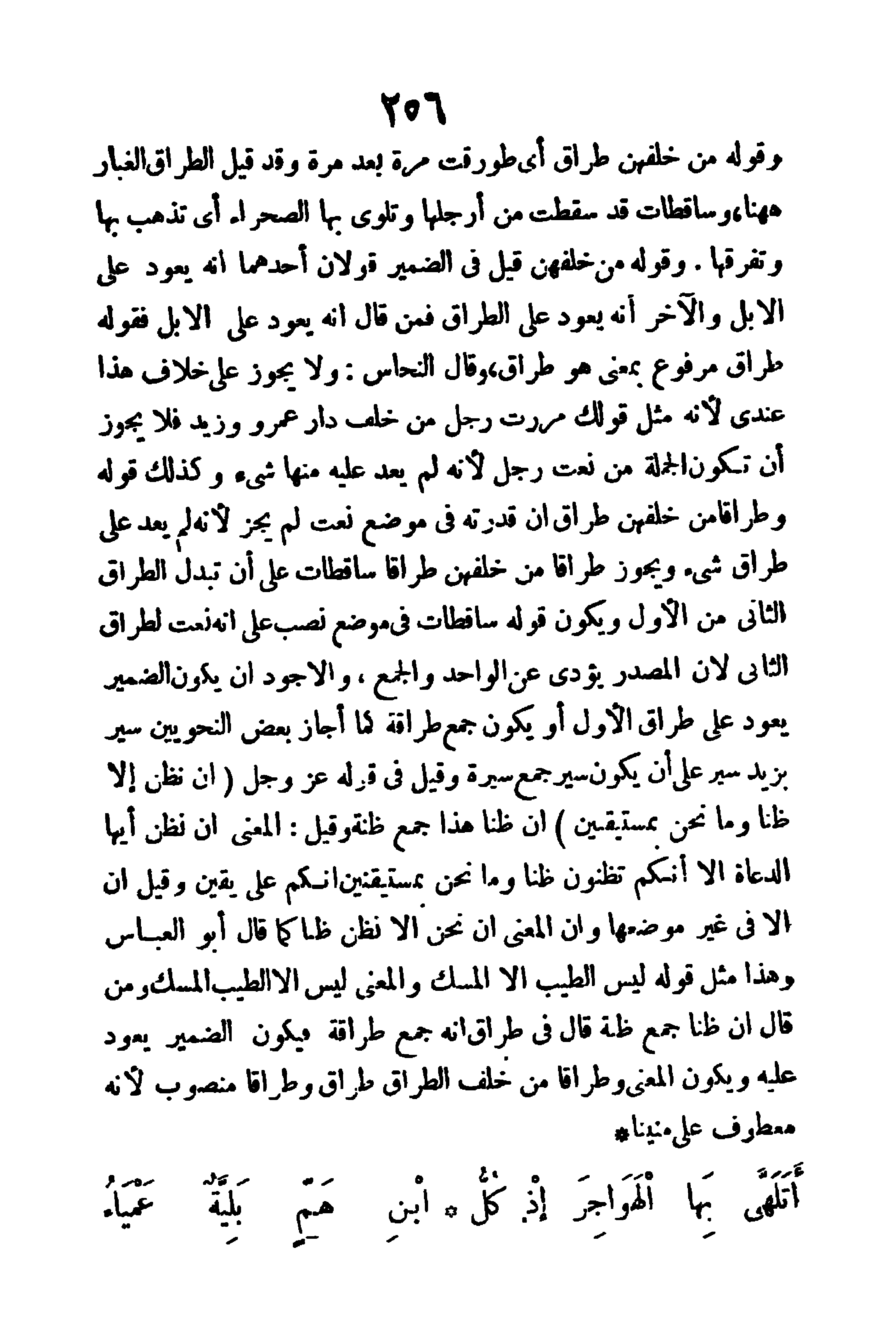 وقوله: (من خلفهن طراق) أي طُورقت مرة بعد مرة، وقد قيل: الطراق الغبار هاهنا، و (ساقطات) قد سقطت من أرجلها، و (تلوى بها الصحراء) أي تذهب بها وتُفرقها، وقوله (من خلفهن) قيل في الضمير قولان، أحدهما: إنه يعود على الإبل، والآخر إنه يعود على الطِّراق، فمن قال إنه يعود على الإبل فقوله (طراق) مرفوع بمعنى هو طراق، وقال النحاس: ولا يجوز على خلاف هذا عندي؛ لأنه مثل قولك: مررت برجل من خلف دار عمرو وزيد، فلا يجوز أن تكون الجملة من نعت رجل؛ لأنه لم يعد عليه منها شيء، وكذلك قوله (وطراقا من خلفهن طراق) أن قدرته في موضع نعت لم يجز؛ لأنه لم يعُد على طراق شيء، ويجوز (طراقا من خلفهن طراقا ساقطات) على أن تُبدل الطراق الثاني من الأول، ويكون قوله ساقطات في موضع نصب على إنه نعت لطراق الثاني؛ لأن المصدر يؤدي عن الواحد والجمع، والأجود على إنه نعت لطراق الثاني؛ لأن المصدر يؤدي عن الواحد والجمع، والأجود أن يكون الضمير يعود على طراق الأول، أو يكون جمع طراقة كما أجاز بعض النحويين (سيرَ بزيدٍ سيرٌ) على أن يكون سير جمع سيرة، وقيل في قوله عز وجل: (إِنْ نَظنُّ إِلاّ ظنًّا وَمَا نَحْنُ بِمُسْتَيِقِنِينَ): أن ظنا هنا جمع ظنة، وقيل: المعنى أن نظن أيها الدُّعاة إلا أنكم تظنون ظنا وما نحن بمستيقنين أنكم على يقين، وقيل: أن إلا في غير موضعها، وإن المعنى أن نحن ألا نظن ظنا، كما قال أبو العباس، وهذا مثل قولهم (ليس الطيب إلا المسك) والمعنى ليس إلا الطيب المسك، ومن قال أن ظنا جمع ظنة قال في طراق إنه جمع طراقة، فيكون الضمير يعود عليه، ويكون المعنى وطراقا من خلف الطراق طراق، وطرافا: منصوب لأنه معطوف على (منينا).