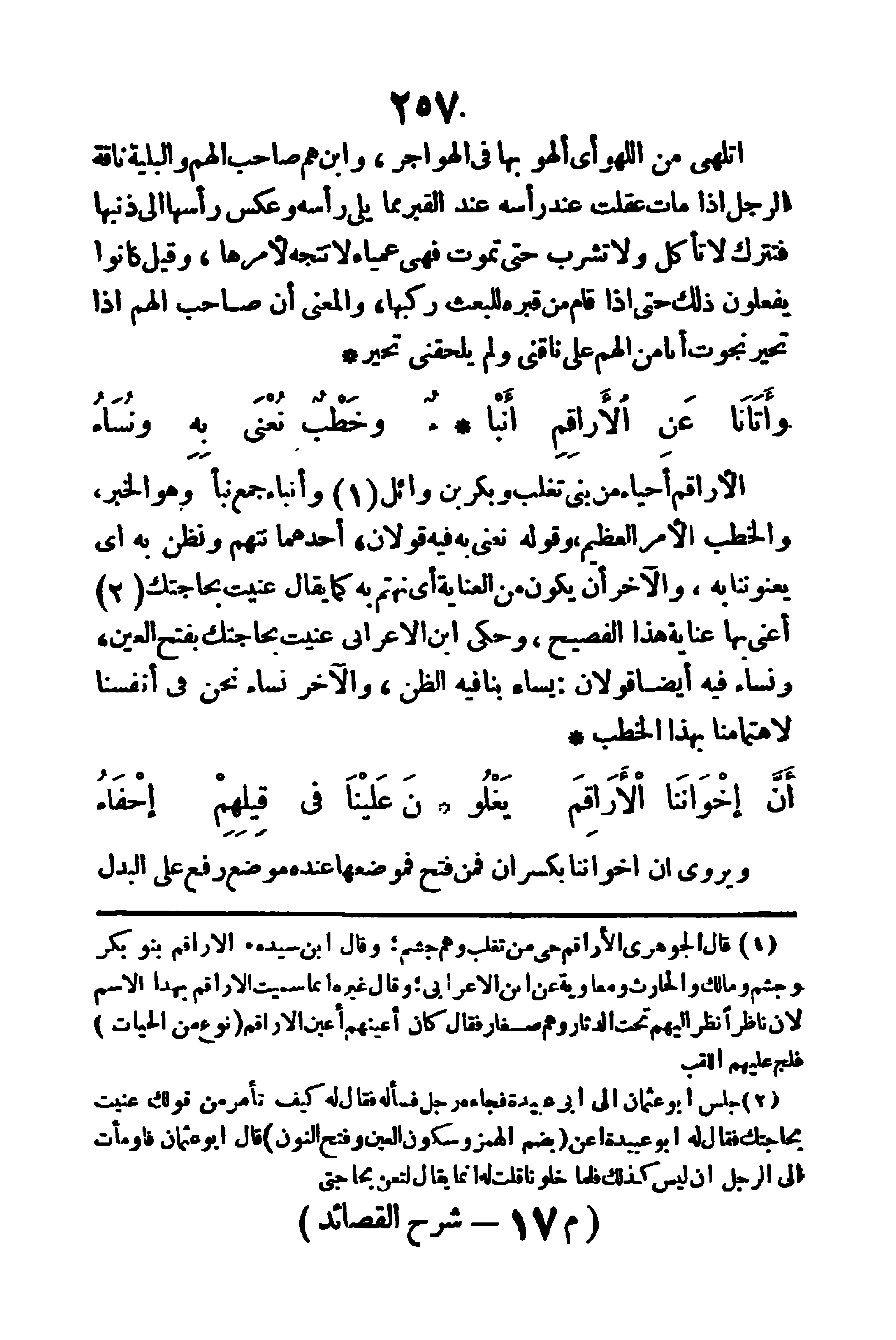 الأراقم: أحياء من بني تغلب وبكر بن وائل وأنباء: جمع نبأ وهو الخبر، والخطب: الأمر العظيم، وقوله (نُعنى به) فيه قولان: أحدهما نُتهم ونظن به، أي يعنوننا به، والآخر أن يكون من العناية، أي نهتم به كما يقال: (عُنيت بحاجتك، أُعنى بها، عناية) هذا الفصيح، وحكى ابن الأعرابي عنيت بحاجتك - بفتح العين - و (نُساء) فيه أيضا قولان: يُساء بنا فيه الظن، والآخر نساء نحن في أنفسنا لاهتمامنا بهذا الخطب.