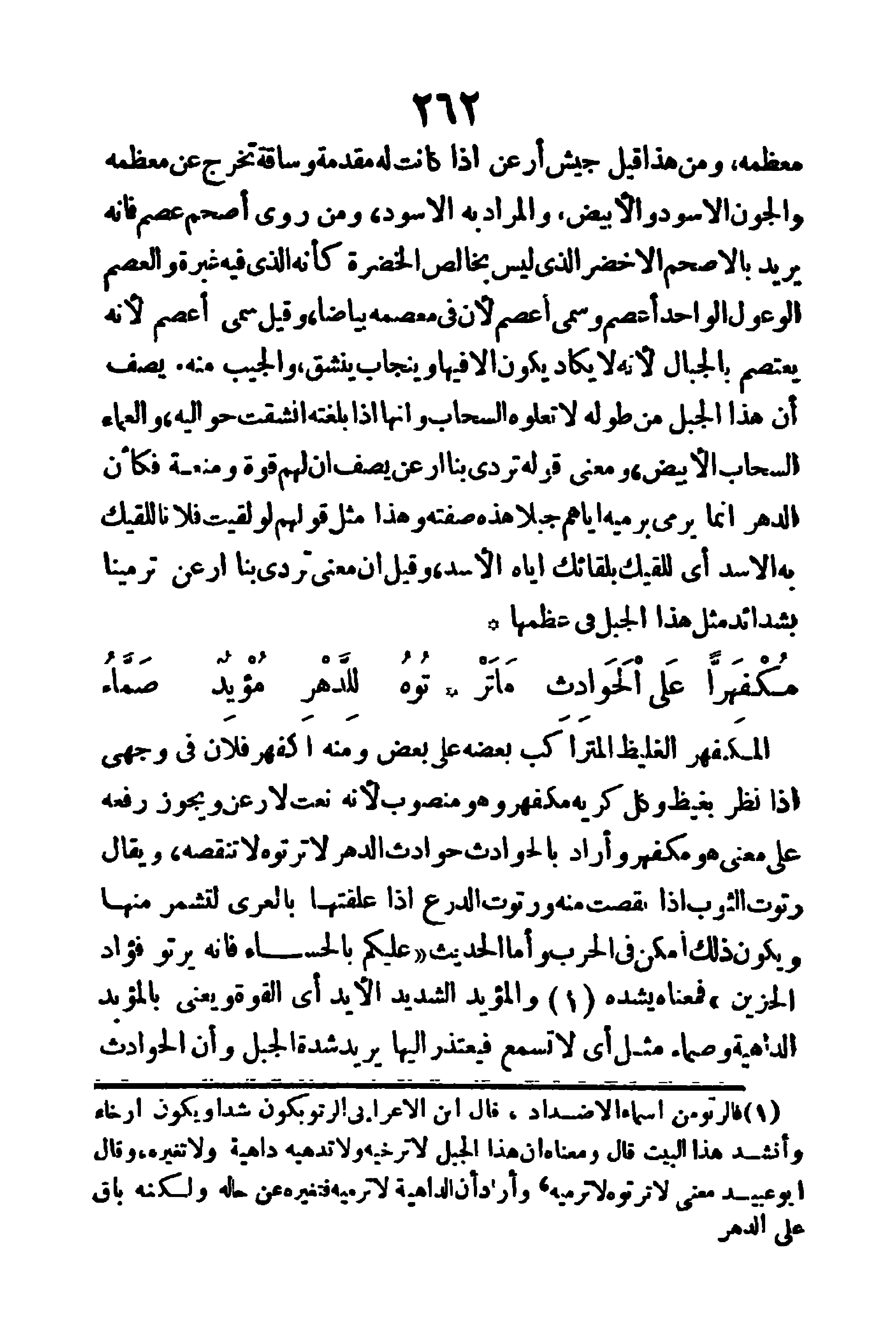 المكفهر: الغليظ المتراكب بعضه على بعض، ومنه (اكفهر فلان في وجهي) إذا نظر بغيظ، وكل كريه مكفهر، وهو منصوب لأنه نعت رعن، ويجوز رفعه على معنى هو مكفهر، وأراد بالحوادث حوادث الدهر، لا ترتوه: لا تنقصه، ويقال (رتوت الثوب) إذا نقصت منه، و (رتوت الدرع) إذا علقتها بالعرى لتشمر منها، ويكون ذلك أمكن في الحرب، وأما الحديث (عليكم بالحساء فإنه يرتو فؤاد الحزين) فمعناه يشده والمؤيد: الشديد الأيد، أي القوة، ويعنى بالمؤيد الداهية، و (صماء) مثل، أي لا تسمع فيعتذر إليها، يريد شدة الجبل وأن الحوادث