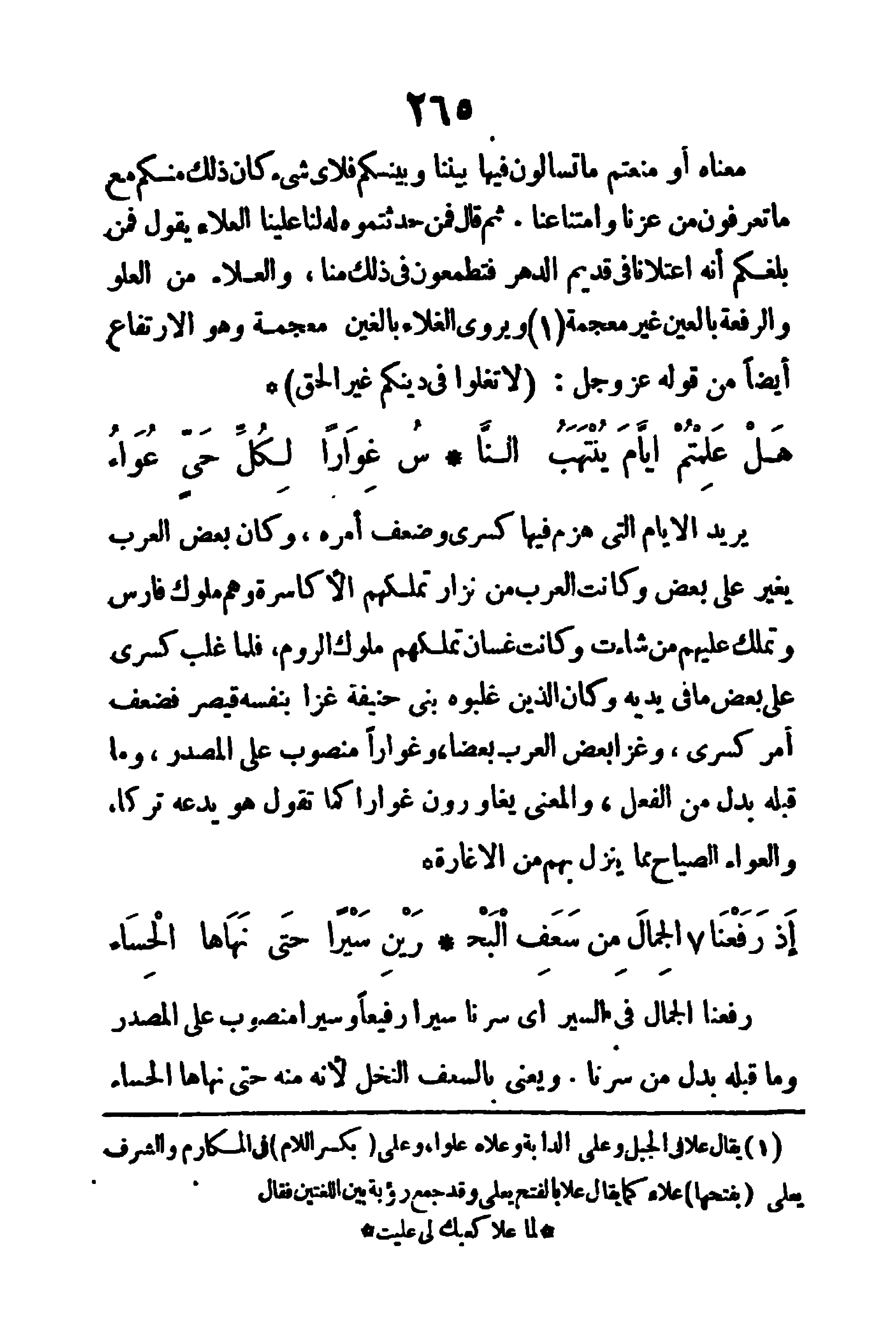 رفعنا الجمال في السير: أي سرنا سيرا رفيعا، وسيرا: منصوب على المصدر، وما قبله بدل من سرنا، ويعنى بالسعف النخل لأنه منه (حتى نهاها الحساء)