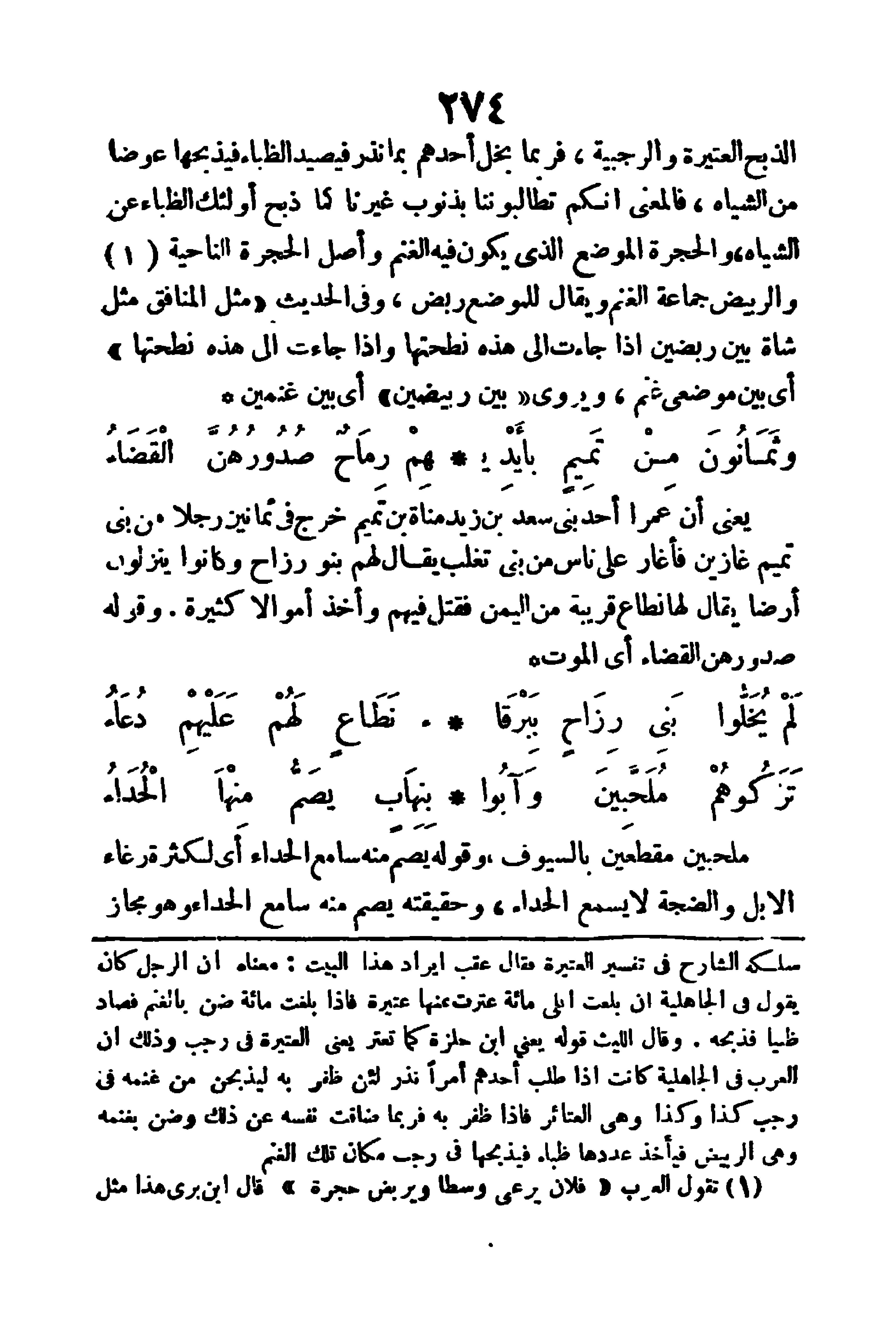الذبح العتيرة والرجبية، فربما بخل أحدهم بما نذر، فيصيد الظباء فيذبحها عوضا من الشياه، فالمعنى إنكم تطالبوننا بذنوب غيرنا كما ذبح أولئك الظباء عن الشياه، والحجرة: الموضع الذي يكون فيه الغنم، وأصل الحجرة الناحية والربيض: جماعة الغنم، ويقال للموضع: ربض، وفي الحديث: (مثل المنافق مثل شاةٍ بين ربضين إذا جاءت إلى هذه نطحتها وإذا جاءت إلى هذه نطحتها) أي بين موضعي غنم، ويروى (بين ربيضين) أي بين غنمين.
