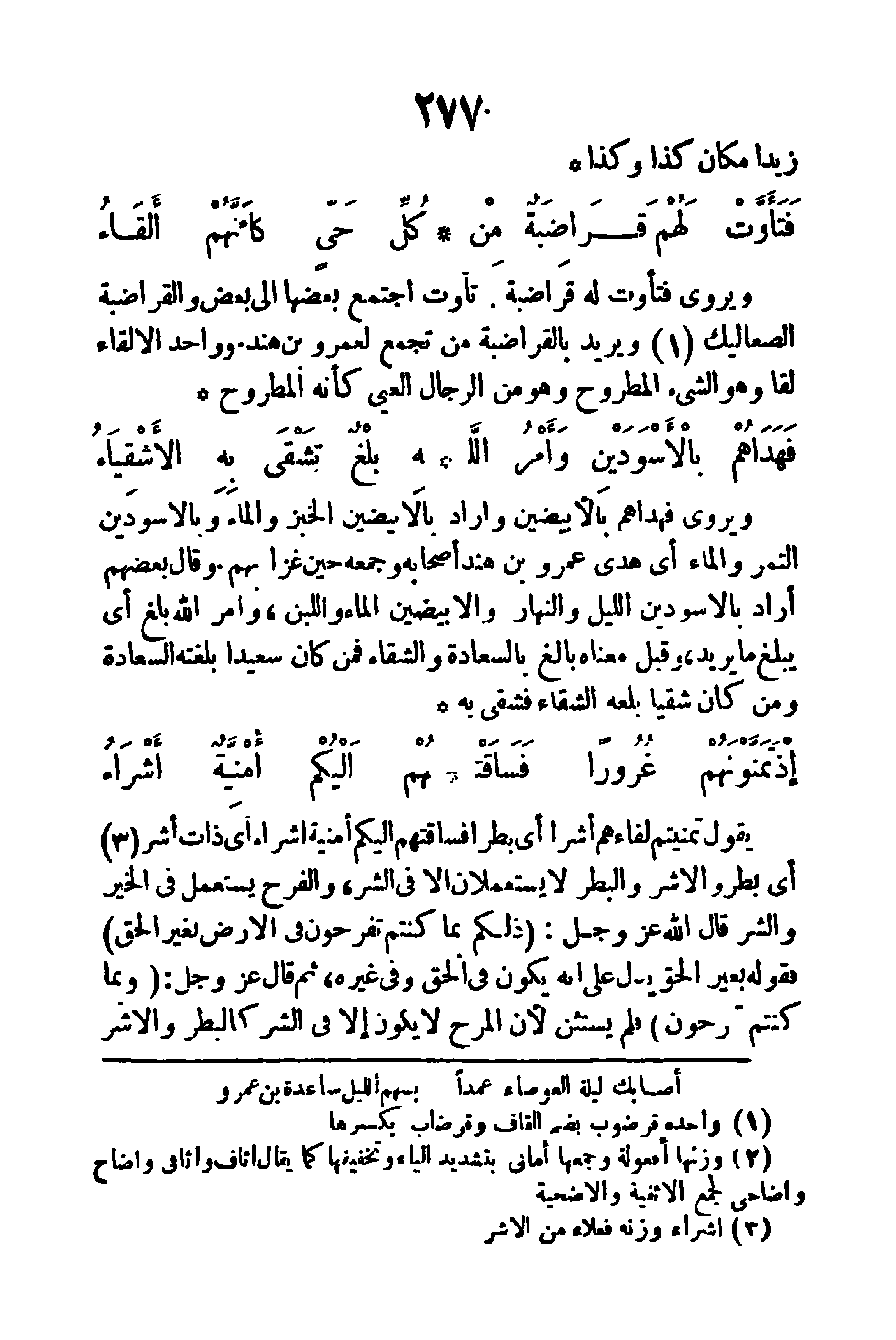 يقول: تمنيتم لقاءهم أشرا، أي بطرا، فساقتهم إليكم أُمنية أشراء، أي ذات أشر، أي بطر، والأشر والبطر لا يستعملان إلا في الشر، والفرح يستعمل في الخير والشر، قال عز وجل: (ذلكُمْ بِمَا كُنْتُمْ تَفْرَحُونَ فِي الأرْضِ بِغَيْرِ الحَقِّ)، فقوله (بغير الحق) يدل على إنه يكون في الحق وفي غيره، ثم قال عز وجل: (وَبِمَا كُنْتُمْ تَمْرَحُونَ)، فلم يستثن؛ لأن المرح لا يكون إلا في الشر كالبطر والأشر،