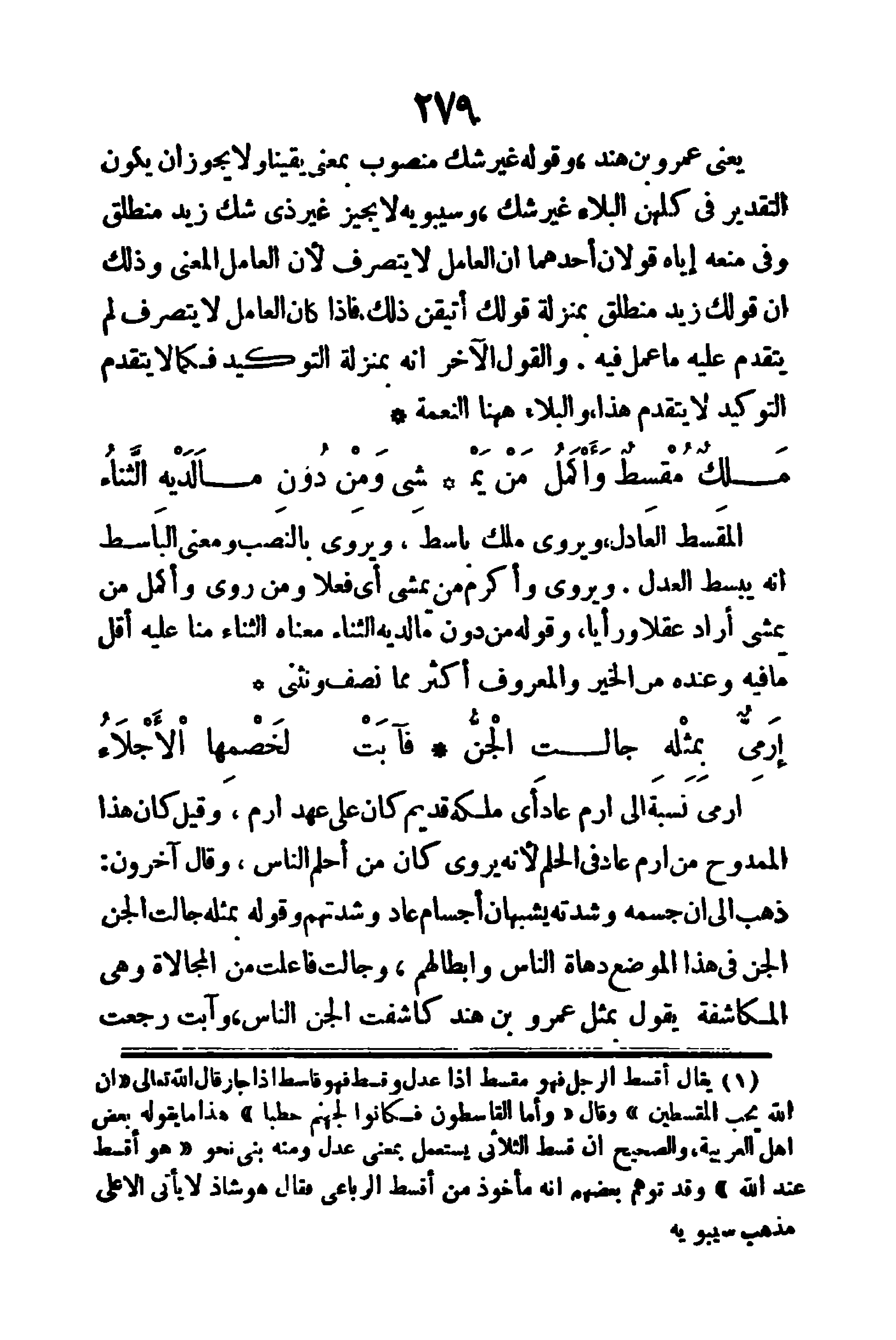 المُقسط العادل، ويروى (ملك باسط) ويروى بالنصب، ومعنى الباسط إنه يبسُطُ العدل، ويروى (وأكرم من يمشي) أي فعلا، ومن روى (وأكمل من يمشي) أراد عقلا ورأيا، وقوله (ومن دون ما لديه الثناء) معناه الثناء منَّا عليه أقل ما فيه، وعنده من الخير والمعروف أكثر مما نصف ونثني.