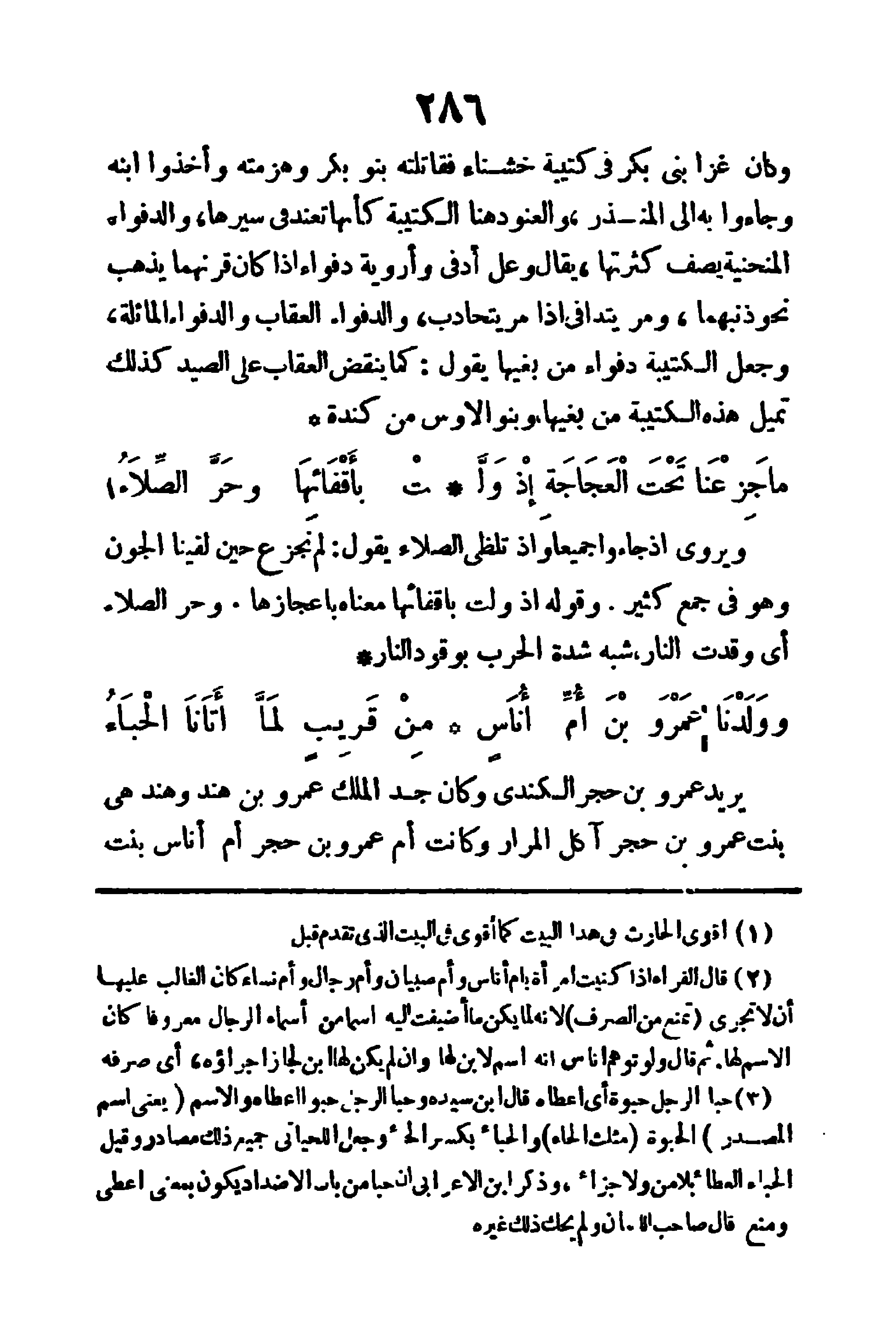 وكان غزا بني بكر في كتيبة خشناء، فقاتلته بنو بكر وهزمته، وأخذوا ابنه، وجاءوا به إلى المنذر، والعنود هنا: الكتيبة كأنها تعند في سيرها، والدفواء: المنحنية، يصف كثرتها، يقال: وعل أدفى، وأروية دفواء، إذا كان قرنهما يذهب نحو ذنبهما، (ومر يتدافى) إذا مر يتحادب، والدفواء: العُقاب، والدفواء: المائلة، وجعل الكتيبة دفواء من بغيها، يقول: كما ينقض العُقاب على الصيد كذلك تميل هذه الكتيبة من بغيها، وبنو الأوس من كندة.