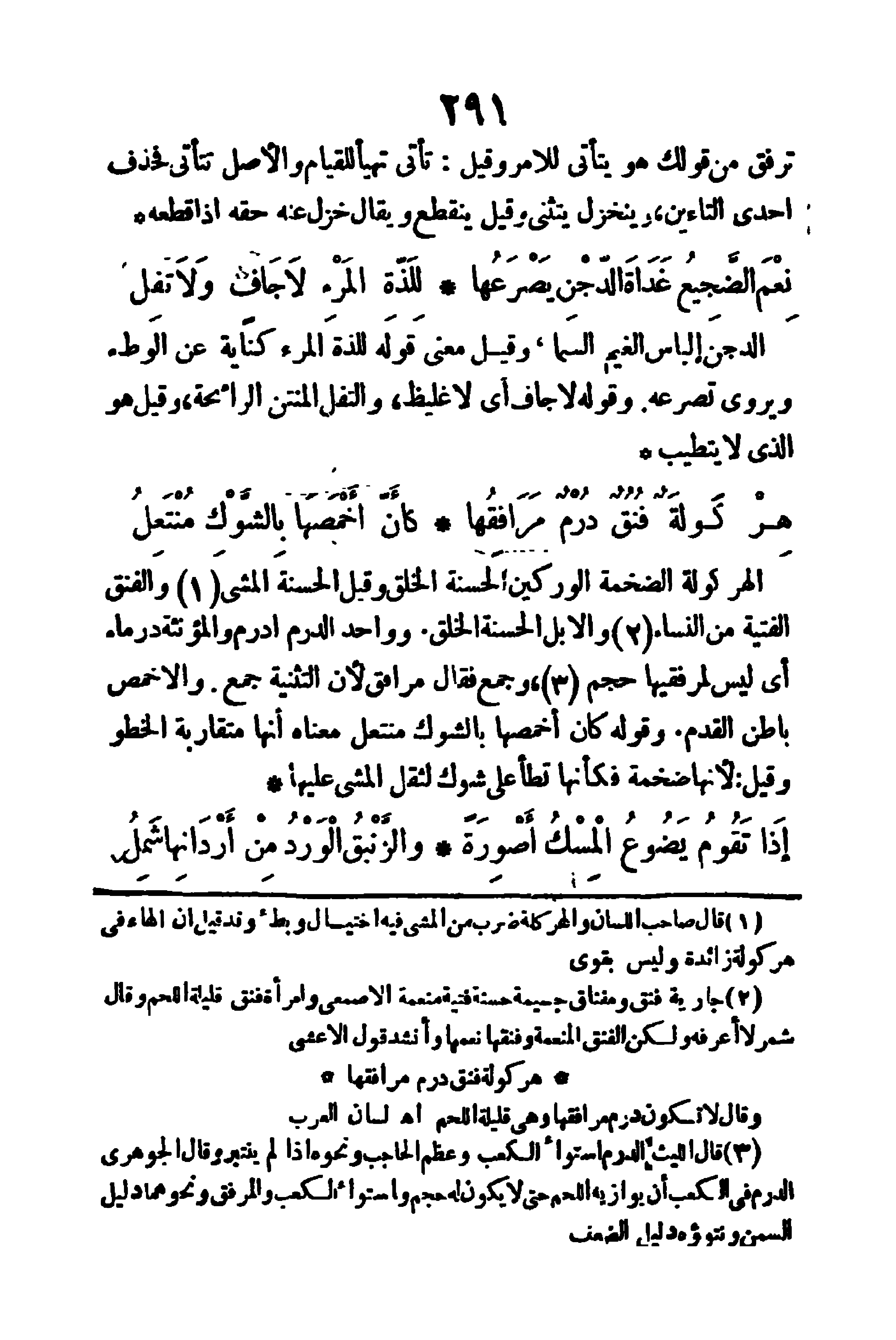 الهركولة: الضخمة الوركين الحسنة الخلق، وقيل: الحسنة المشي والفنق: الفتية من النساء والإبل الحسنة الخلق، وواحد الدُّرم أدرم، والمؤنثة درماء، أي ليس لمرفقيها حجم، وجمع فقال (مرافق) لأن التثنية جمع، والأخمص: باطن القدم، وقوله (كأن أخمصها بالشوك منتعل) معناه إنها متقاربة الخطو، وقيل: لأنها ضخمة فكأنها تطأ على شوك لثقل المشي عليها.