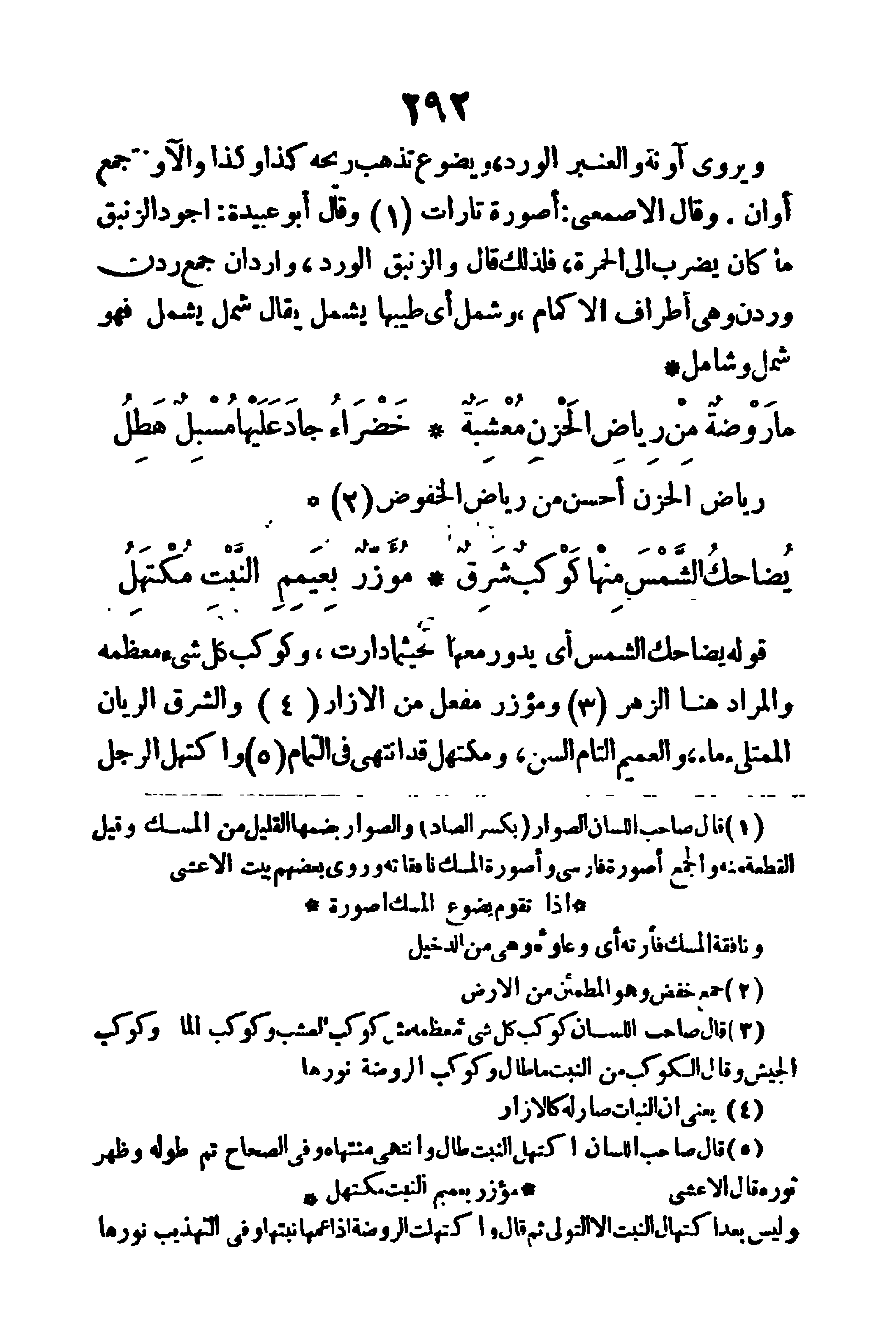 قوله (يضاحك الشمس) أي يدور معها حيثما دارت، وكوكب كل شيء: معظمه، والمراد هنا الزهر ومؤزَّر: مُفعَّل من الإزار، والشرق: الريَّان الممتلئ ماء، والعميم: التام السن، ومكتهل: قد انتهى في التمام، و (اكتهل الرجل)