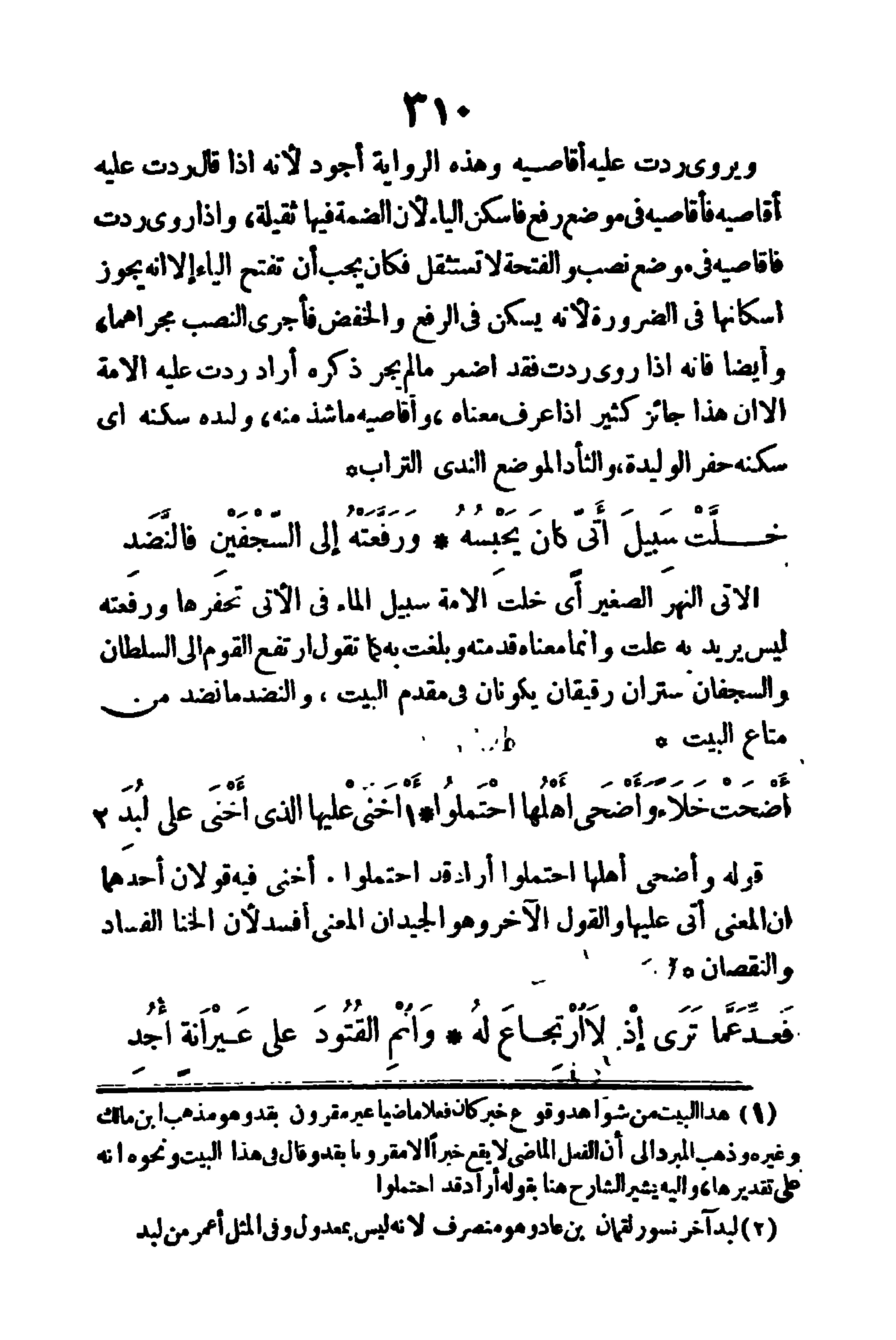 ويروى (رُدَّت عليه أقاصيه) وهذه الرواية أجود؛ لأنه إذا قال (رُدَّت عليه أقاصيه) فأقاصيه في موضع رفع، فأسكن الياء؛ لأن الضمة فيها ثقيلة، وإذا روى ردت فأقاصيه في موضع نصب، والفتحة لا تستثقل، فكان يجب أن تفتح الياء، إلا إنه يجوز إسكانها في الضرورة، لأنه يسكن في الرفع والخفض، فأجرى النصب مجراهما، وأيضا فإنه إذا روى (رَدَّت) فقد أضمر ما لم يجر ذكره، أراد رَدَّت عليه الأمة، إلا أن هذا جائز كثير إذا عُرف معناه، وأقاصيه: ما شَذَّ منه، ولبده: سكنه، أي سكنه حفر الوليدة، والثأد: الموضع الندى التراب.