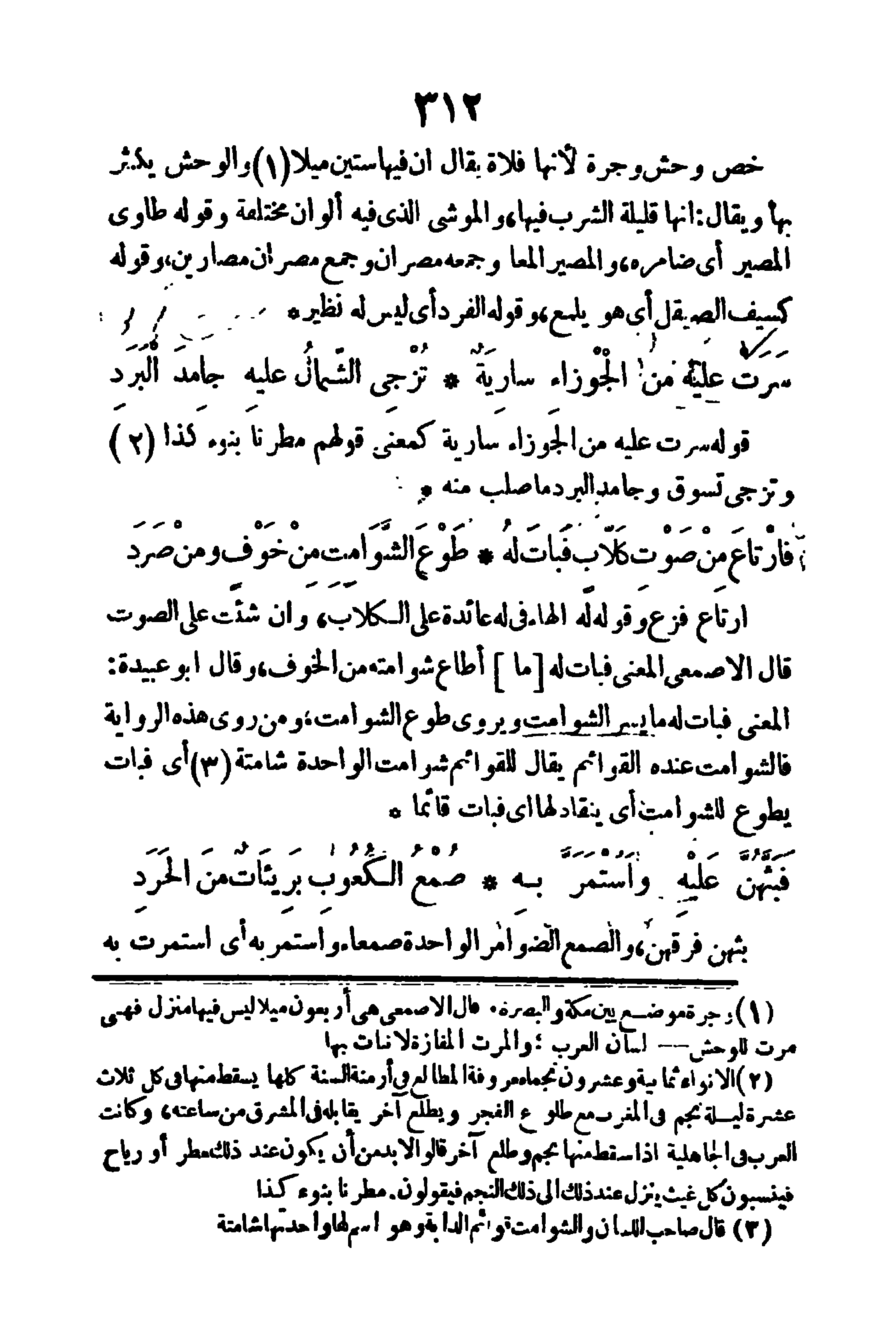 خَصَّ وحش وجرة لأنها فلاة، يقال: أن فيها ستين ميلا، والوحش يكثر بها، ويقال: إنها قليلة الشرب فيها، والموشي: الذي فيه ألوان مختلفة، وقوله (طاوى المصير) أي ضامره، والمصير: المعا، وجمعه مصران، وجمع مصران مصارين، وقوله (كسيف الصيقل) أي هو يلمع، وقوله (الفرد) أي ليس له نظير.