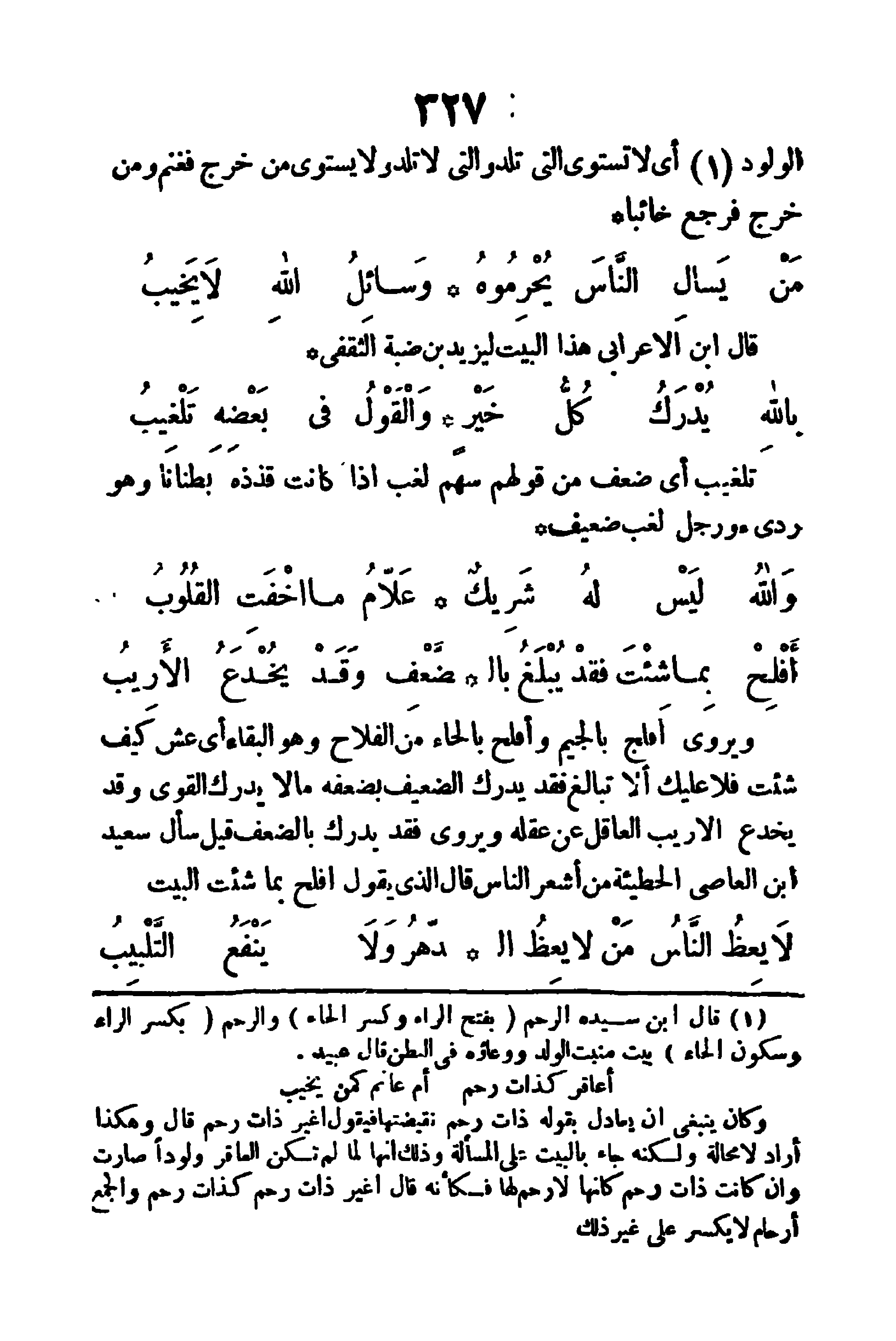 ويروى (أفلج) بالجيم، و (أفلح) بالحاء من الفلاح وهو البقاء؟ أي عش كيف شئت فلا عليك ألا تبالغ، فقد يدرك الضعيف بضعفه ما لا يدرك القوي، وقد يخدع الأريب العاقل عن عقله، ويروى (فقد يدرك بالضعف) قيل: سأل سعيد بن العاصي الحطيئة: من أشعر الناس؟ قال: الذي يقول (أفلح بما شئت. . . البيت).