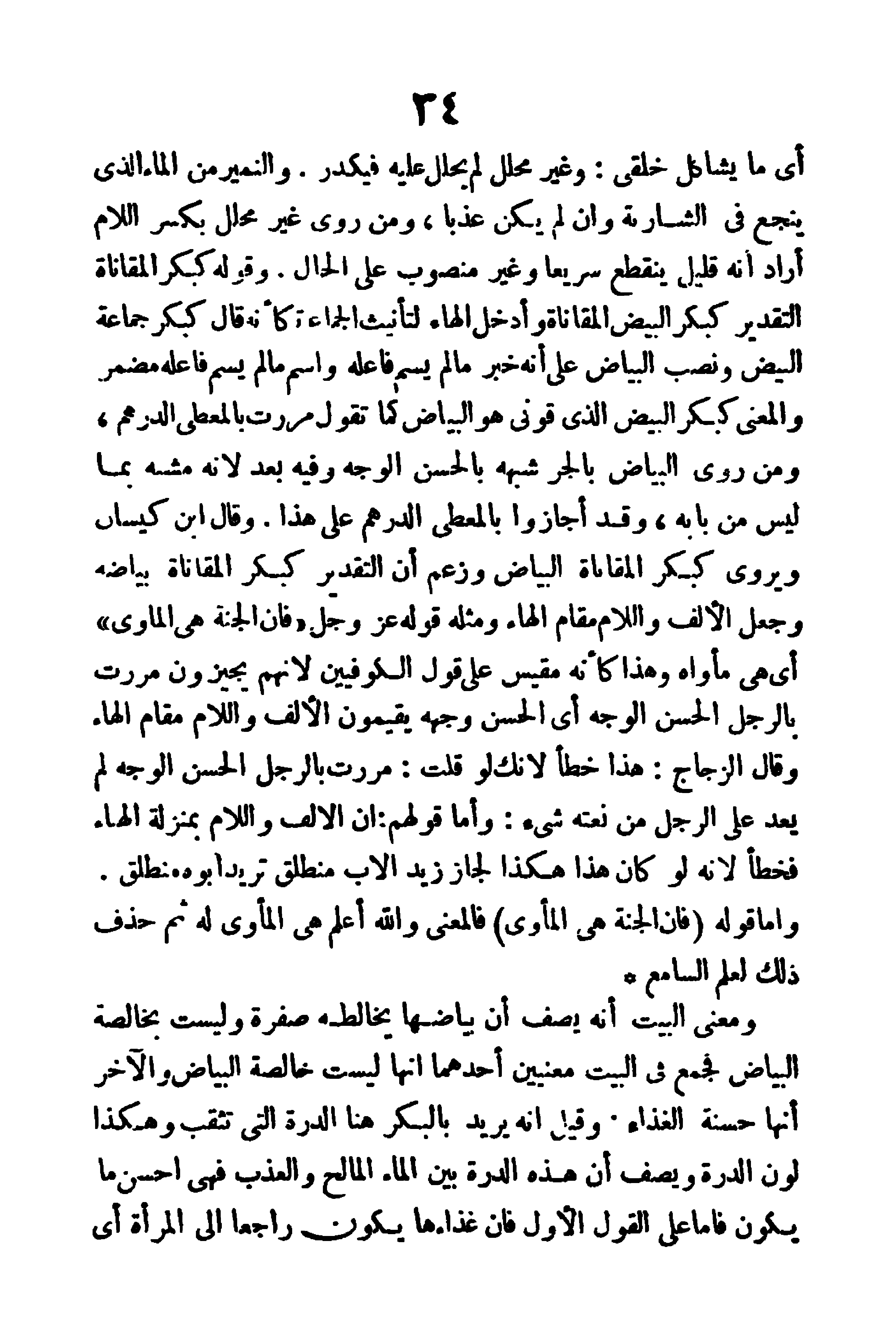 ونصب (البياض) على إنه خبر ما لم يسم فاعله، واسم ما لم يسم فاعله مضمر، والمعنى كبكر البيض الذي قوني هو البياض، كما تقول: مررت بالمعطى الدرهم، ومن روى (البياض) بالجر شبهه بالحسن الوجه، وفيه بعد؛ لأنه مشبَّه بما ليس من بابه، وقد أجازوا بالمعطى الدرهم على هذا، وقال ابن كيسان: ويروى (كبكر المقاناة البياض) وزعم أن التقدير كبكر المقاناة بياضه، وجعل الألف واللام مقام الهاء، ومثله قوله عز وجل (فإِنَّ الجَنَّةَ هِيَ المَأَوَى) أي هي مأواه، وهذا كأنه مقيس على قول الكوفيين؛ لأنهم يجيزون (مررت بالرجل الحسن الوجه) أي الحسن وجهه، يقيمون الألف واللام مقام الهاء، وقال الزجاج: هذا خطأ، لأنك لو قلت (مررت بالرجل الحسن الوجه) لم يعد على الرجل من نعته شيء، وأما قولهم: أن الألف واللام بمنزلة الهاء فخطأ؛ لأنه لو كان هذا هكذا لجاز (زيد الأب منطلق) تريد أبوه منطلق، وأما قوله: (فإِنَّ الجَنَّةَ هِيَ المَأوَى) فالمعنى والله أعلم هي المأوى له، ثم حذف ذلك لعلم السامع.