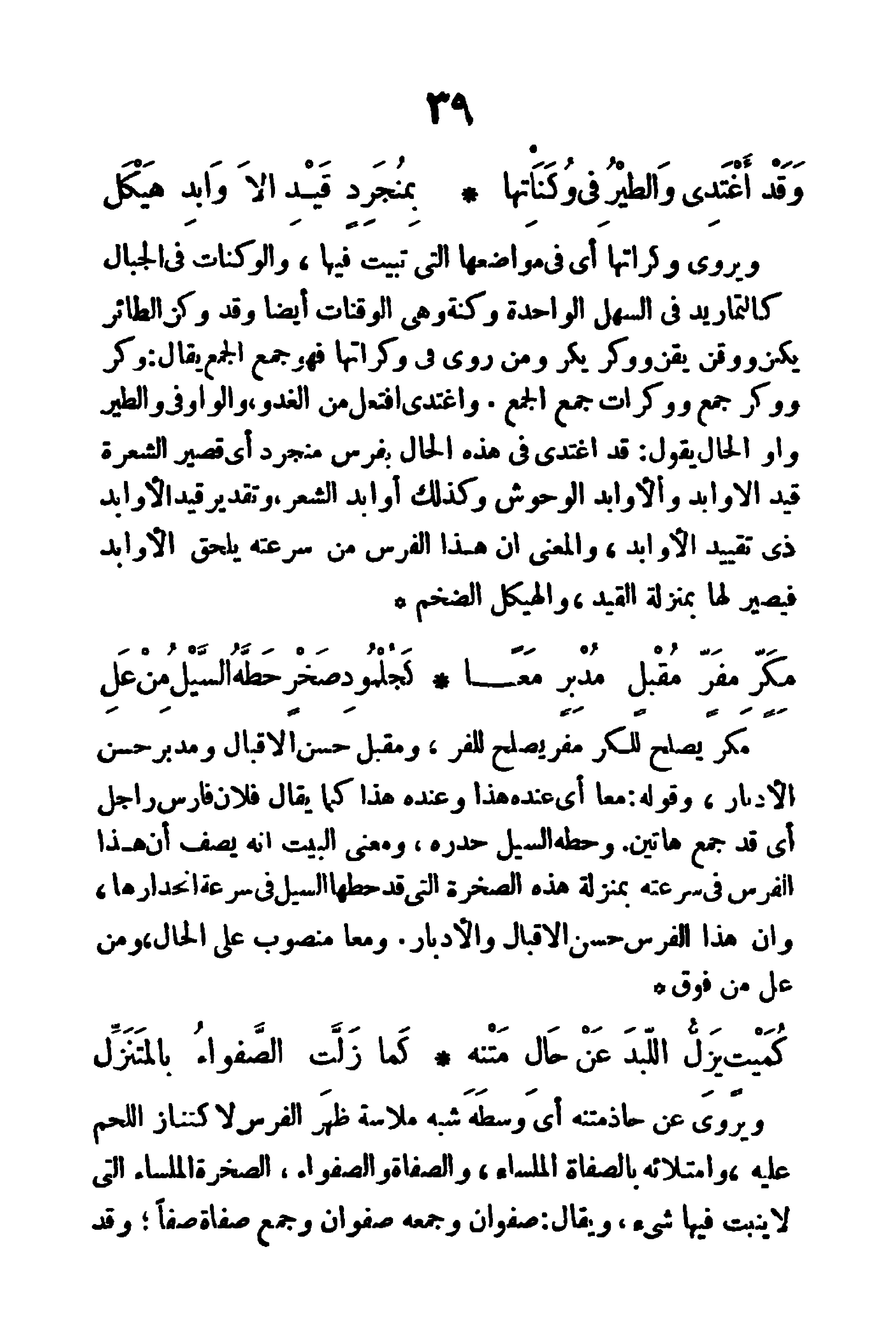 مكر: يصلح للكر، ومفر: يصلح للفر، ومُقبل: حسن الإقبال، ومُدبر: حسن الأدبار، وقوله (معا) أي عنده هذا وعنده هذا، كما يقال: فلان فارس راجل، أي قد جمع هاتين، و (حطه السيل) حدره، ومعنى البيت إنه يصف أن هذا الفرس في سرعته بمنزلة هذه الصخرة التي قد حطها السيل في سرعة انحدارها، وأن الفرس حسن الإقبال والأدبار، و (معا) منصوب على الحال، و (من عل) من فوق.