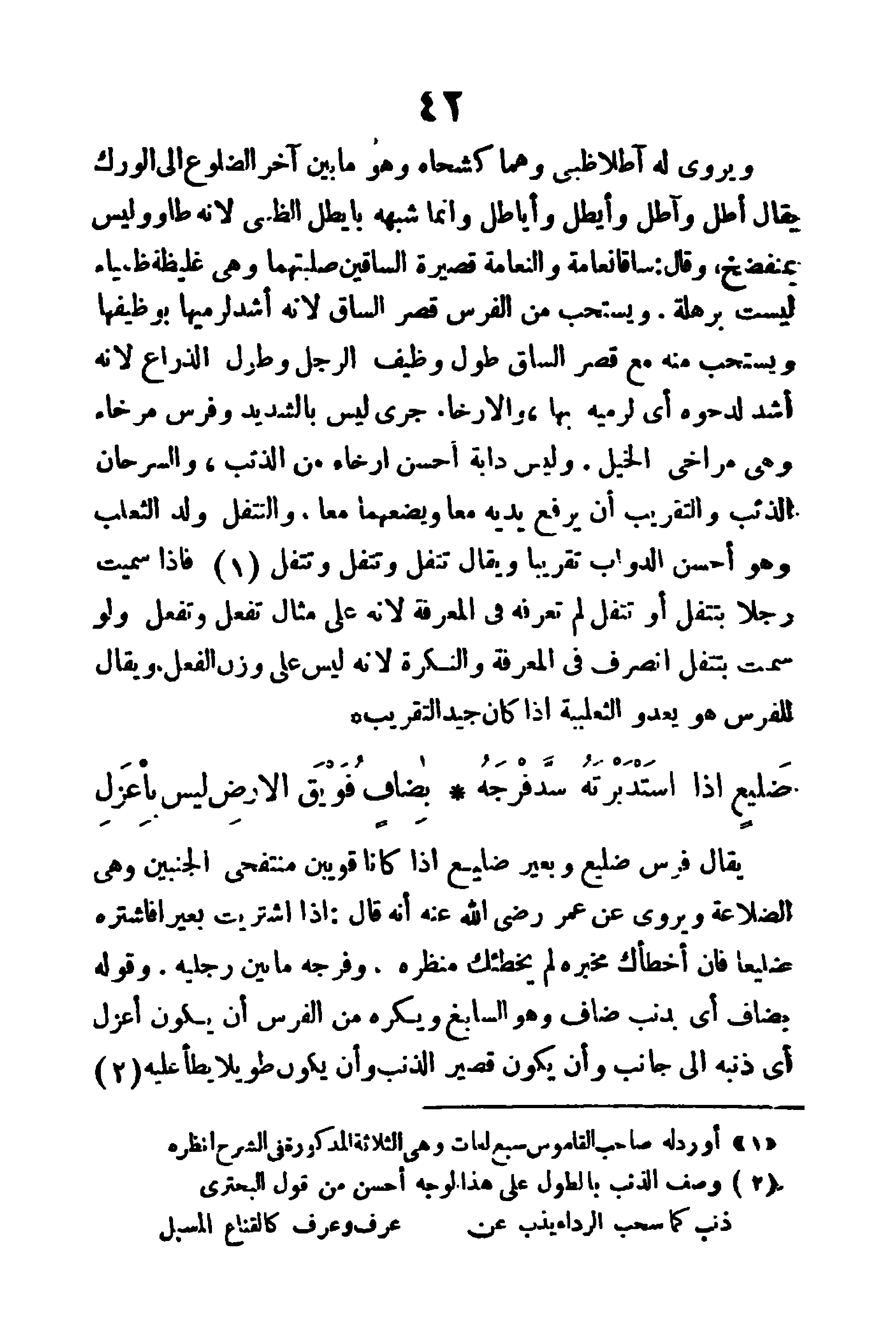 ويروى (له آطلا ظبي) وهما كشحاه، وهو ما بين آخر الضلوع إلى الورك، يقال: إطل وآطال وأيطل وأياطل، وإنما شبهه بأيطل الظبي لأنه طاو وليس بمنفضخ، وقال: (ساقا نعامة) والنعامة قصيرة الساقين صلبتهما، وهي غليظة ظمياء ليست برهلة، ويستحب من الفرس قصر الساق لأنه أشد لرميها بوظيفها، ويستحب منه - مع قص الساق - طول وظيف الرجل وطول الذراع؛ لأنه أشد لدحوه أي لرميه بها، والإرخاء: جرى ليس بالشديد، وفرس مرخاء، وهي مراخي الخيل، وليس دابة أحسن إرخاء من الذئب، والسرحان: الذئب، والتقريب: أن يرفع يديه معا ويضعهما معا، والتَّتْفُل: ولد الثعلب، وهو احسن الدواب تقريبا، ويقال: تَتْفُل وتَتَفْل وتُتْفُل فإذا سميت رجلا بتَتْفُل أو تَتْفَل لم تصرفه في المعرفة؛ لأنه على مثال تَفْعُل، وتَفَعَل، ولو سميت بِتُتْفُل انصرف في المعرفة والنكرة؛ لأنه ليس على وزن الفعل، ويقال للفرس: هو يعدو الثعلبية؛ إذا كان جيد التقريب