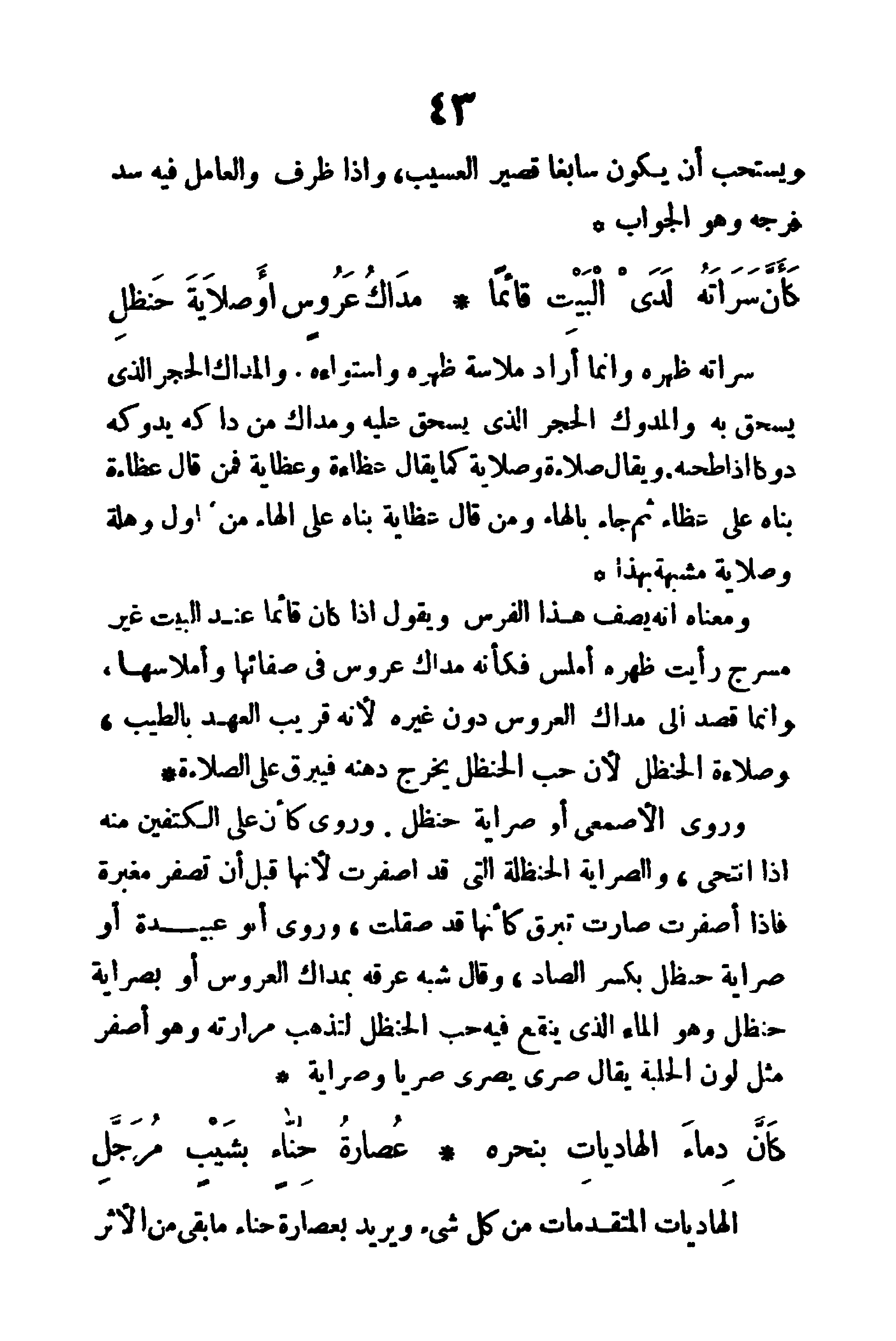 (كَأَنَّ سَرَاتَهُ لَدَى البَيْتِ قَائِماً ... مَدَاكُ عَرُوسٍ أو صَلاَيَةُ حَنْظَلِ)
