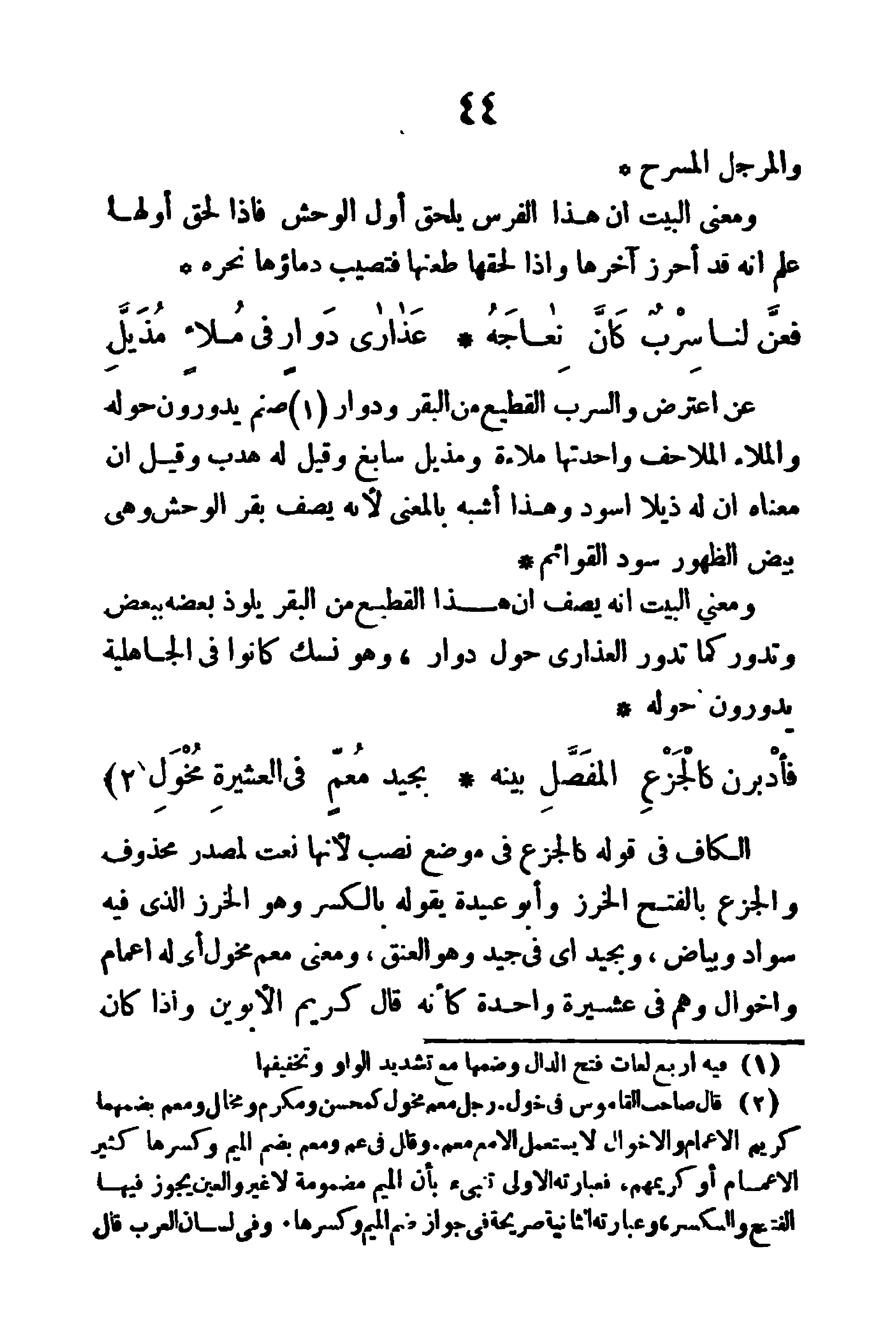 (فَعَنَّ لَنَا سِرْبٌ كَأَنّ! َ نِعَاجَهُ ... عَذَارَى دَوَارٍ فيِ مُلاَءٍ مُذَيَّلِ)